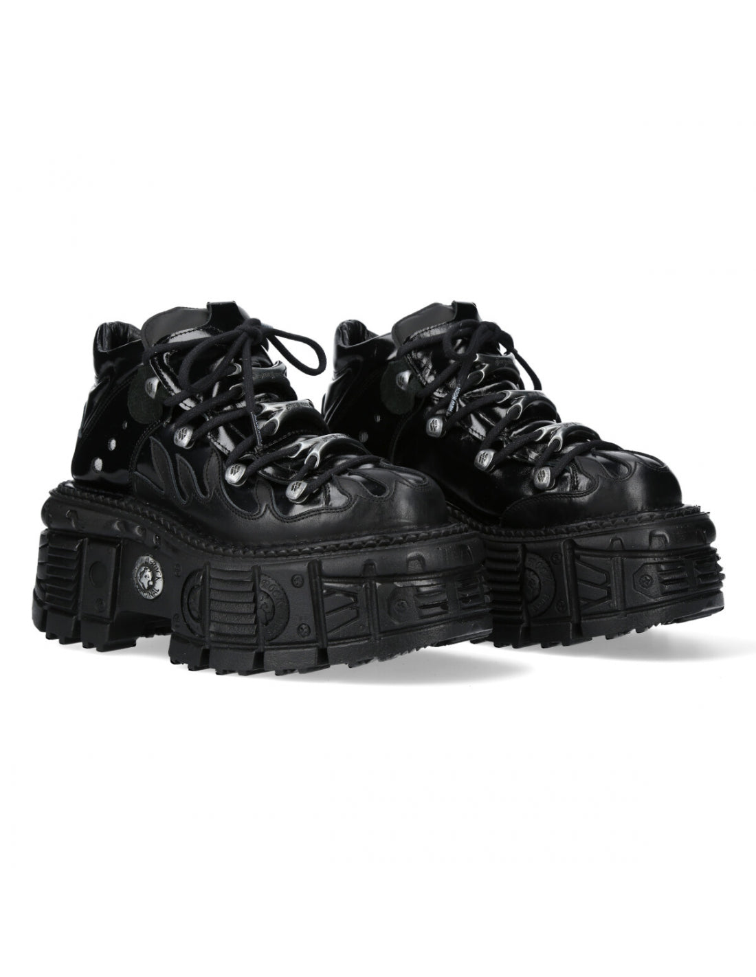 New Rock - The ultimate goth footwear brand from Spain! From the Metallic collection comes the M-MET031-C3 in full black genuine leather with flame-shaped panels subtly layered through the upper. Silver metal lace hardware adds contrast against the monochrome finish, all sitting on a heavy black platform sole for that classic all-black New Rock look.