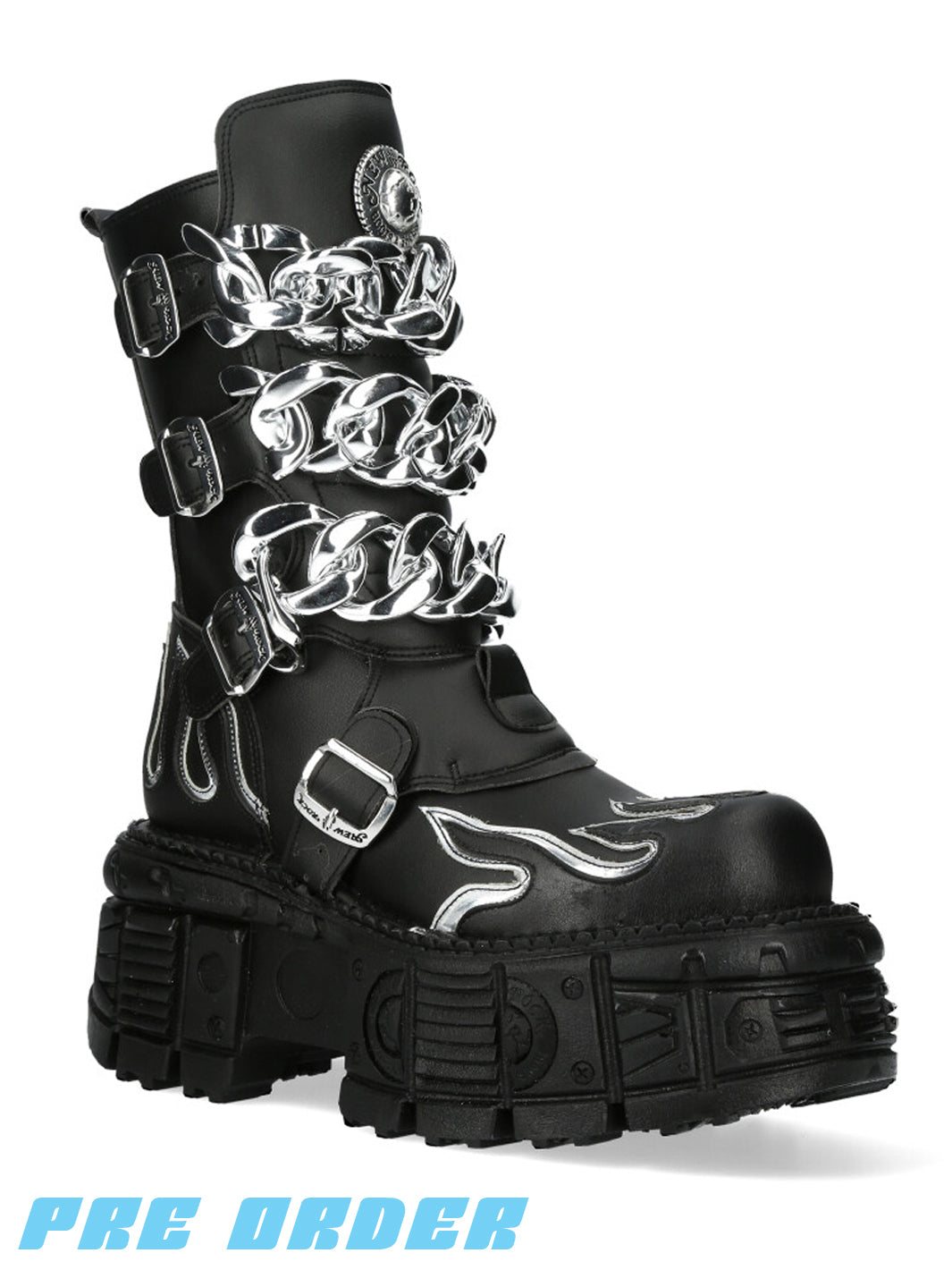 New Rock - The ultimate goth footwear brand from Spain! From the Metallic collection comes the M-MET032-V1 in matte black with silver flame detailing and oversized chrome chain straps across the front. Finished with silver buckle hardware, a side zip, and that signature heavy New Rock sole, this one is made to stand out.
