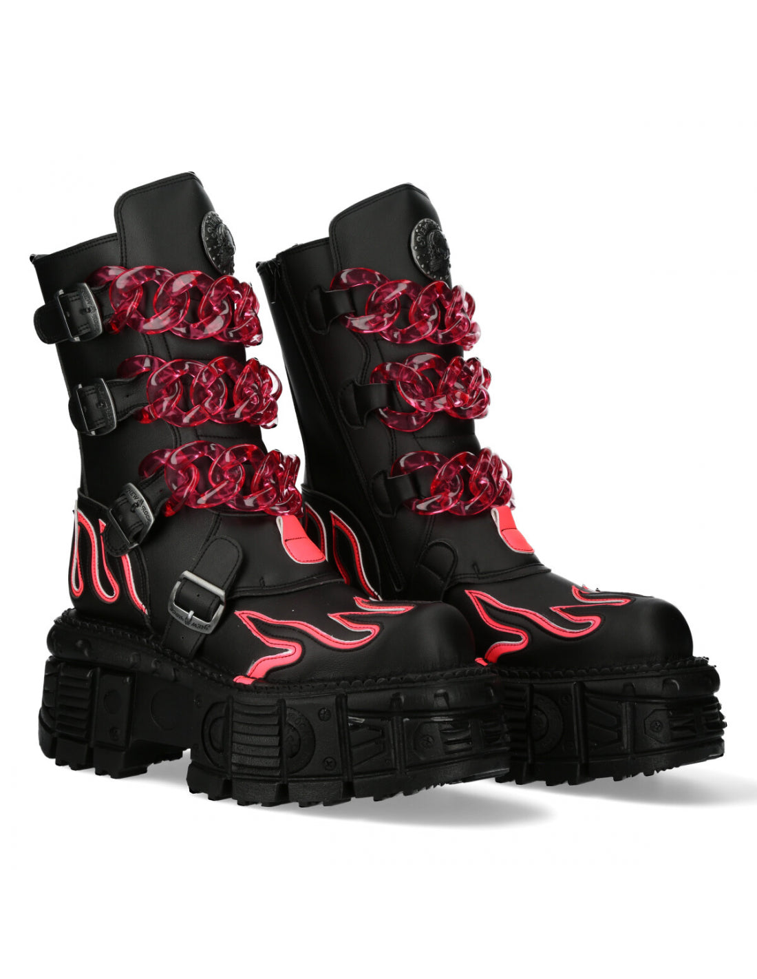 New Rock - The ultimate goth footwear brand from Spain! From the Metallic collection comes the M-MET032-V5 in matte black with bold neon pink flame detailing and oversized translucent chain straps across the front. Finished with a side zip and that signature heavy New Rock sole, this pair brings serious heat from top to bottom.
