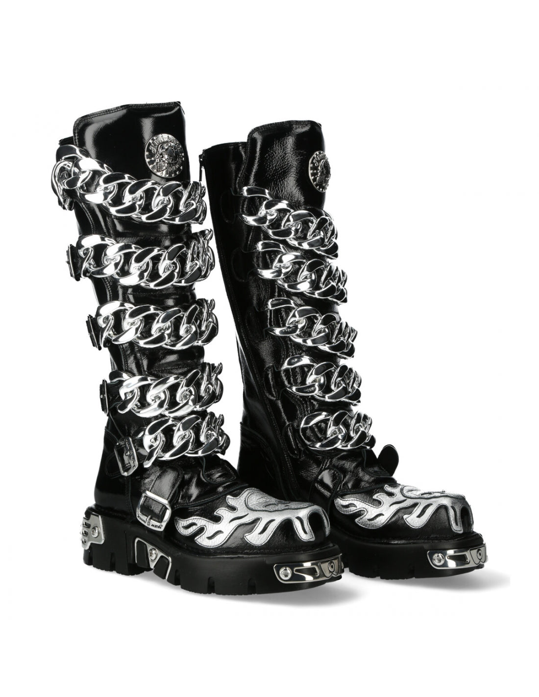 New Rock – The ultimate goth footwear brand from Spain! From the Metallic collection comes the M-MET033-C1, an ultra high genuine leather boot stacked with bold silver chain straps all the way up the front. Finished with oversized metallic flame detailing at the toe, skull badge at the top, and heavy metal hardware at the sole, this pair is built loud and unapologetic.