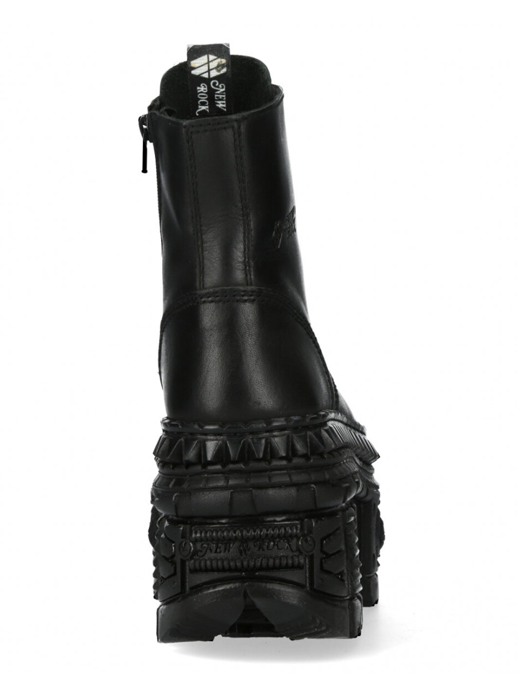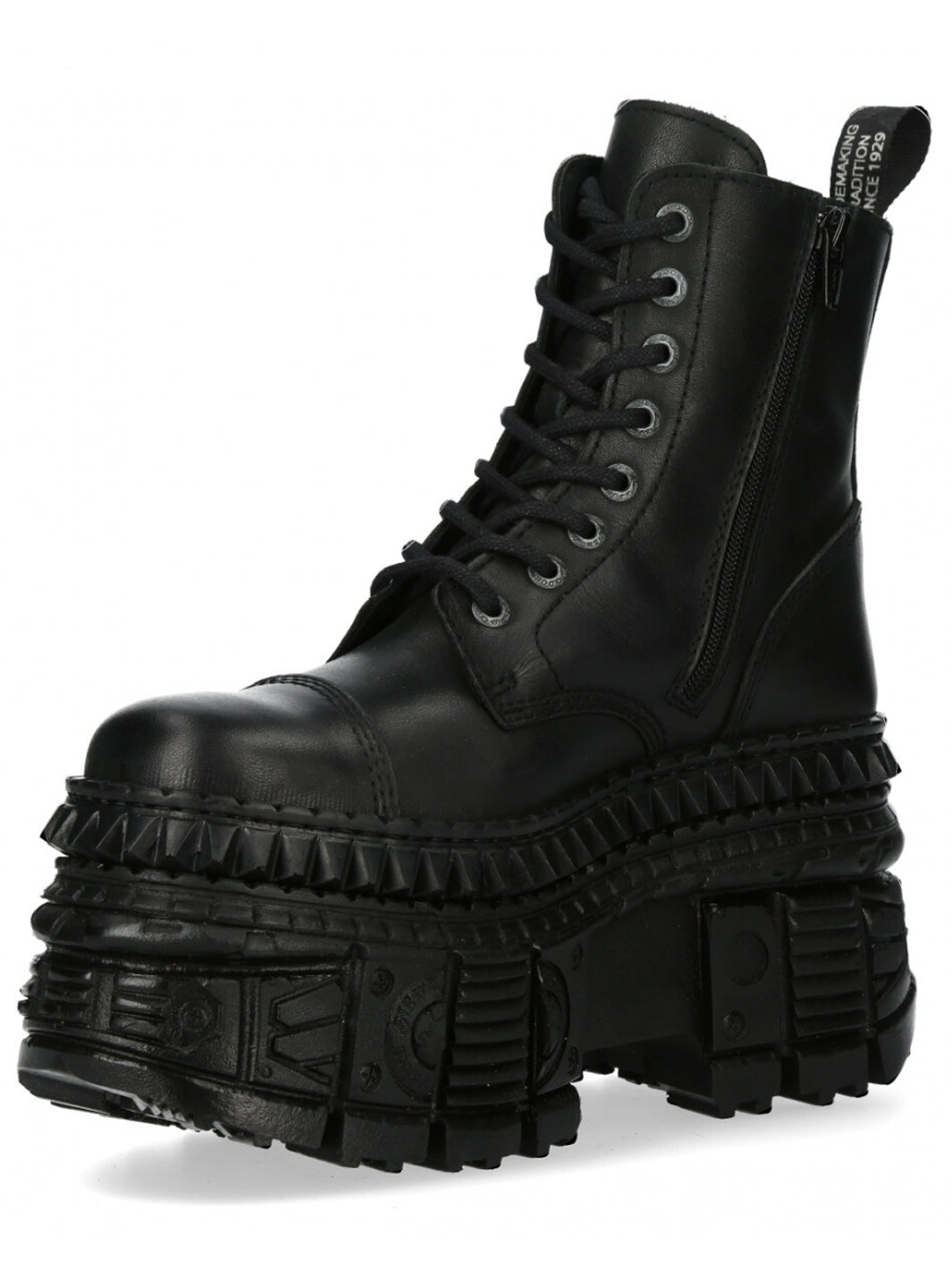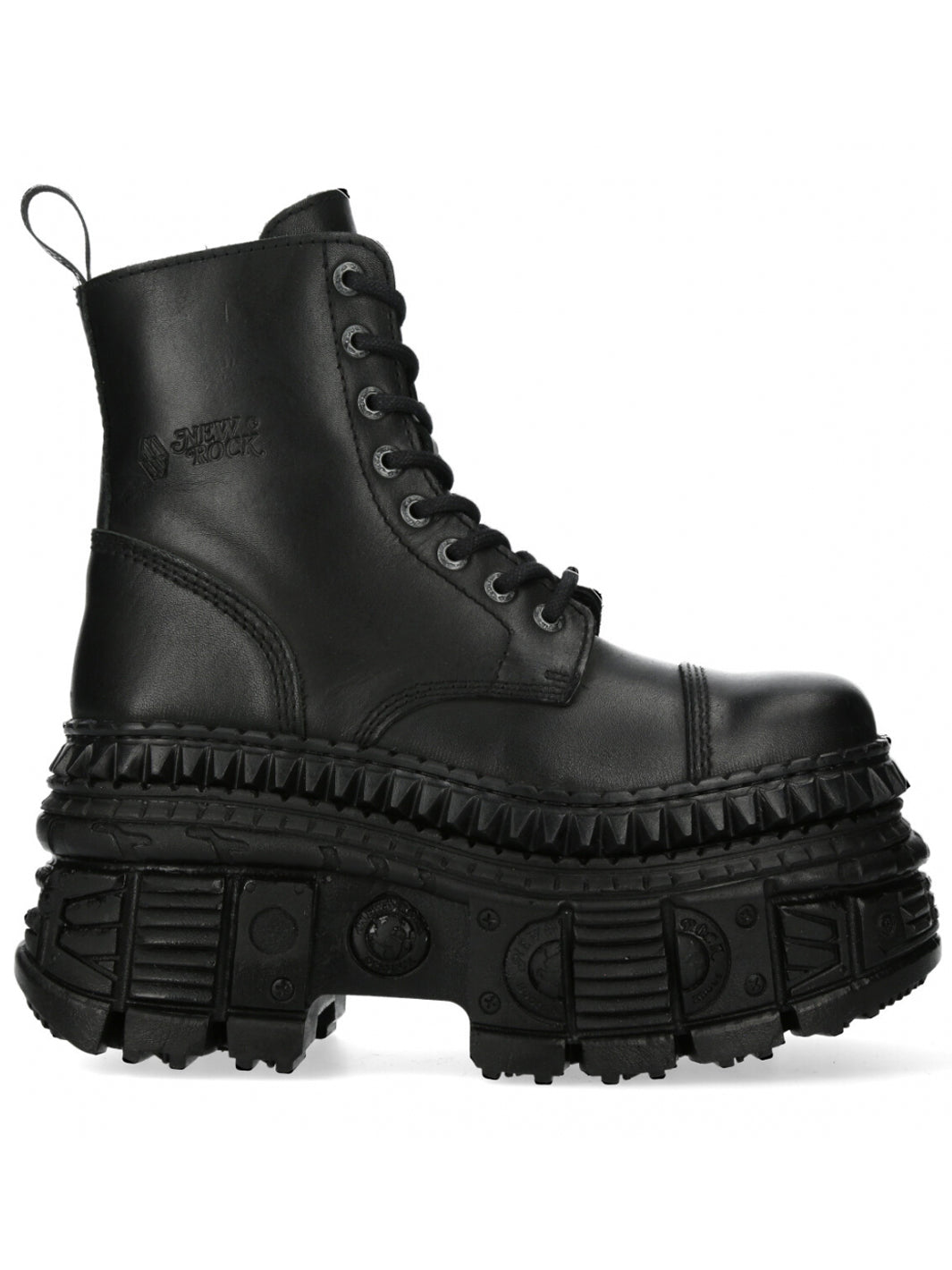 Level up in these iconic lace up black combat boots. These New Rock give you height with their chunky rubber and patterned platform embossing. A punk rock black motif continues throughout the boots with black eyelet lace holes.