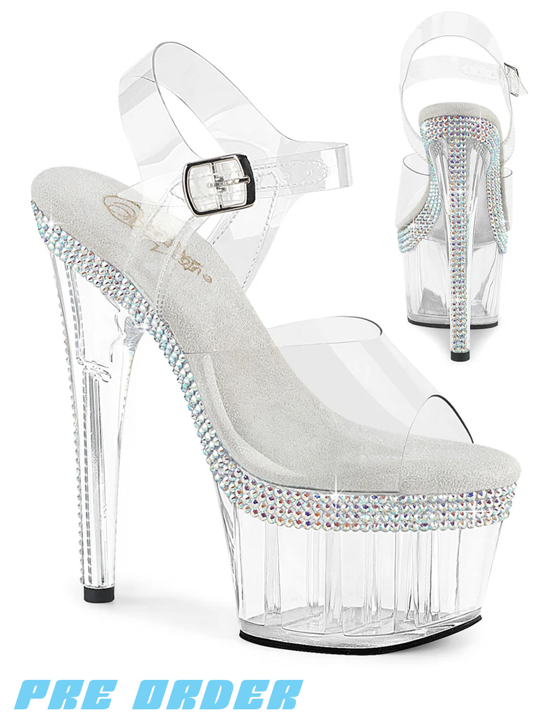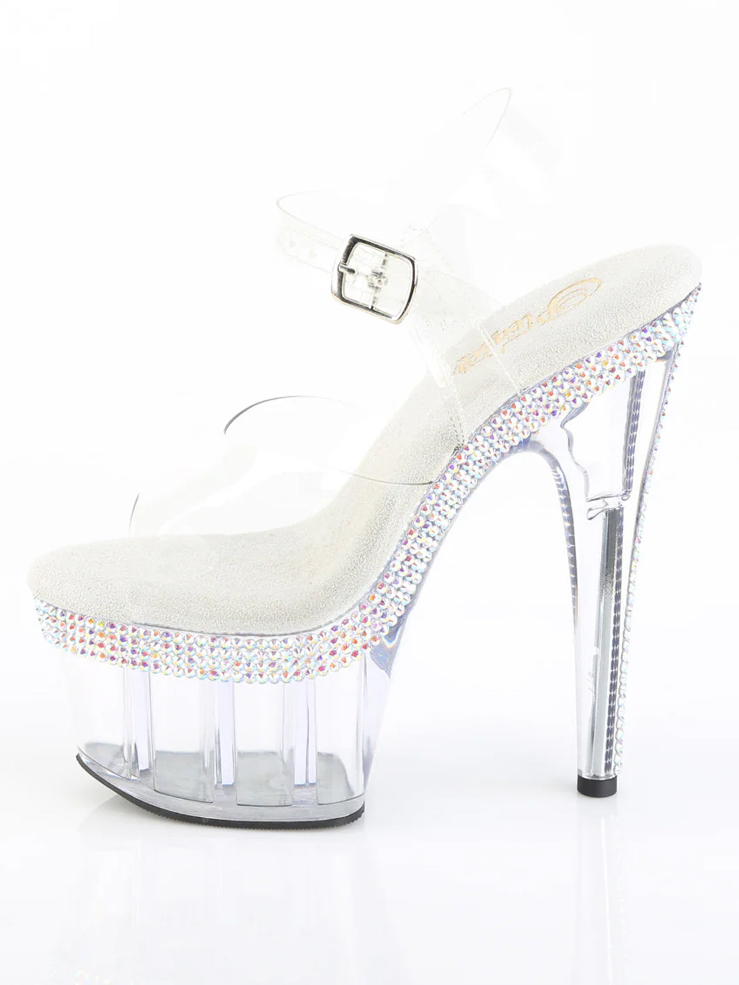 - Multiple rows of AB rhinestones on the platform top edge and heel