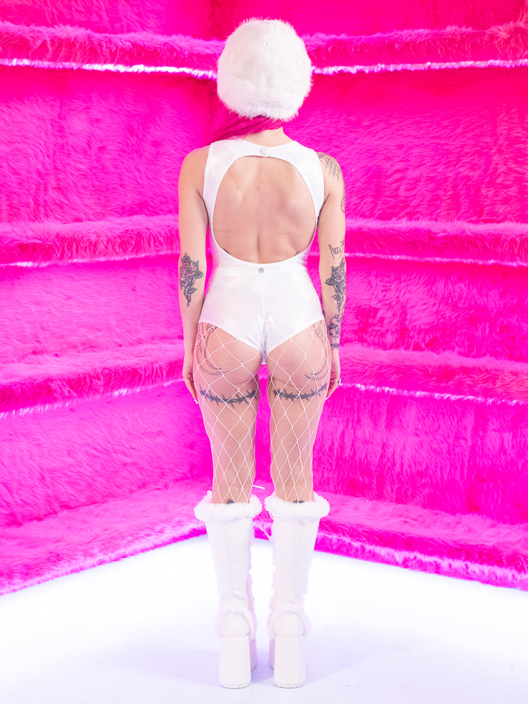 This v front mesh bodysuit in the magical white holo snake will have you shining, especially when under the disco lights!