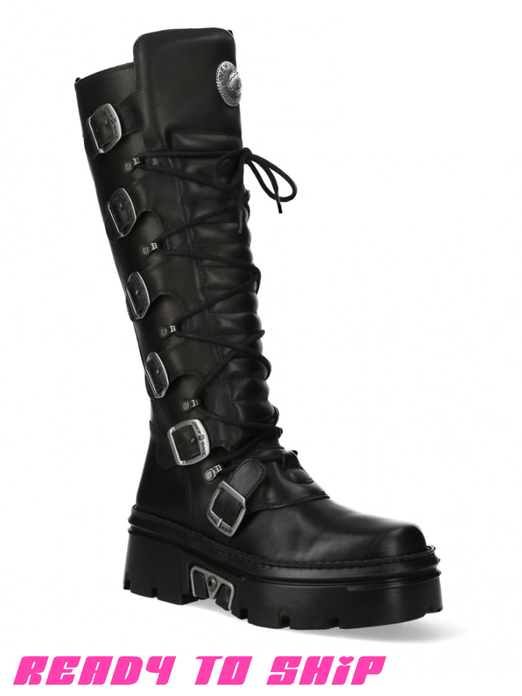 Level up in these iconic lace up combat boots. From the Metallic collection comes the M-WALL272-S1, a towering black leather boot with bold lace-up, buckle and zip details. Heavy, striking, and built with New Rock’s signature platform - a true classic loaded with attitude and premium craftsmanship.