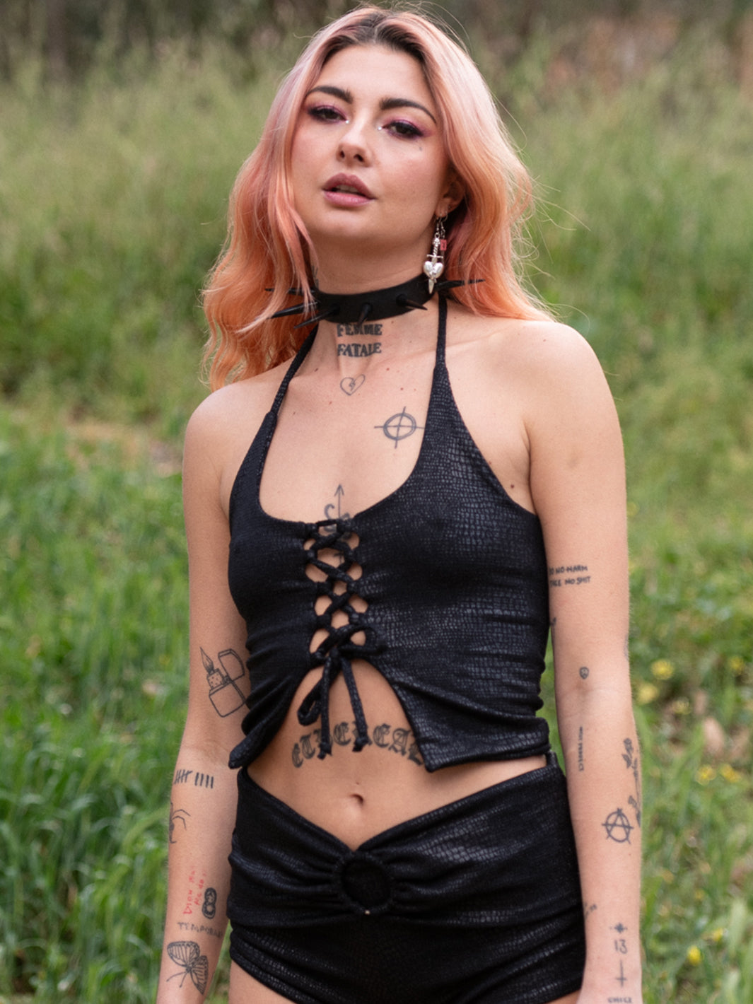 This gorgy halter neck style comes with an adjustable tie front, made from a sick snake-vibe fabric. Handmade with love in Melbourne by our besties at Soulan Zee!