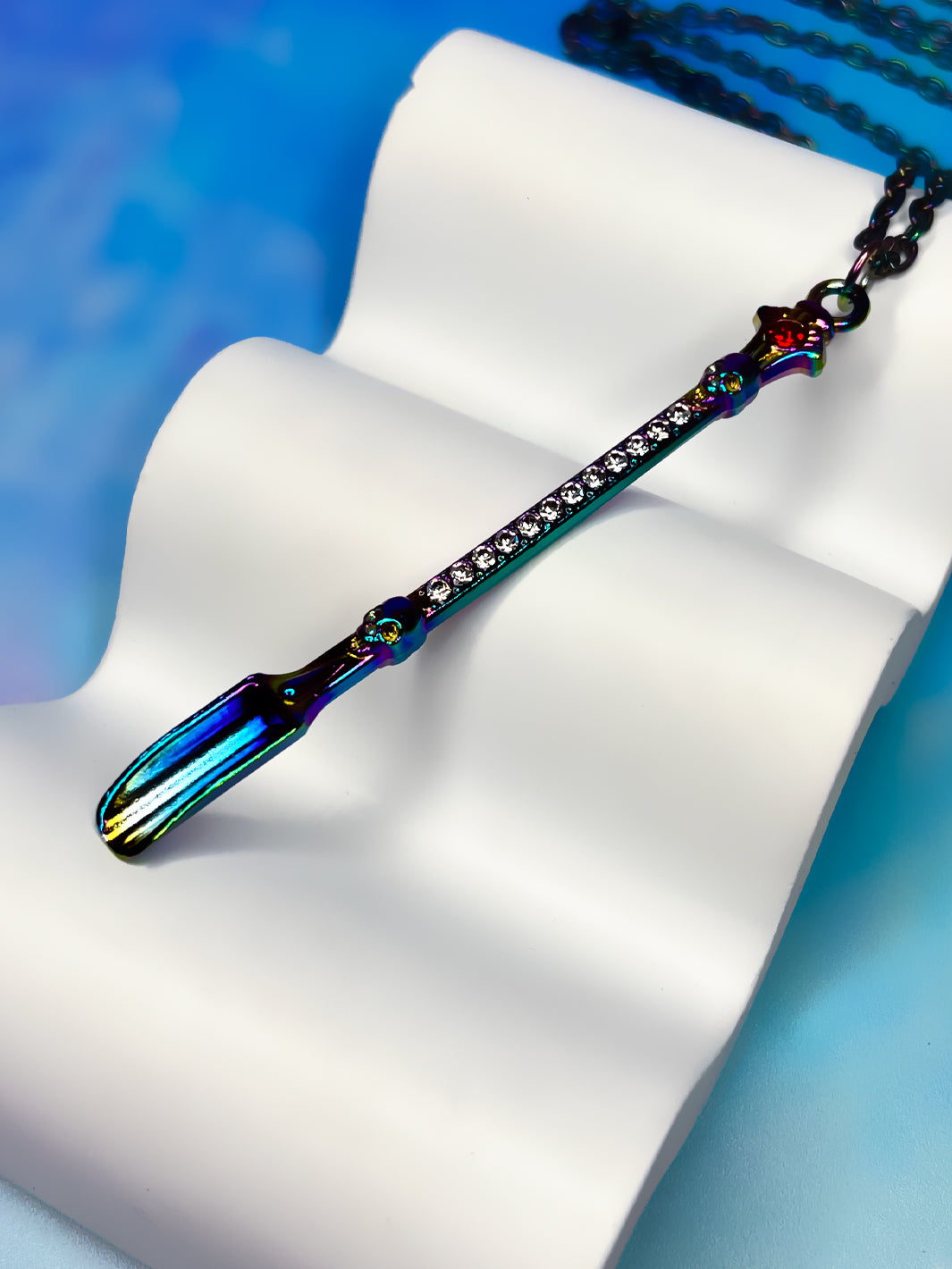 A costume-oil slick necklace, with an oversized & ornate diamonte scooper pendant.