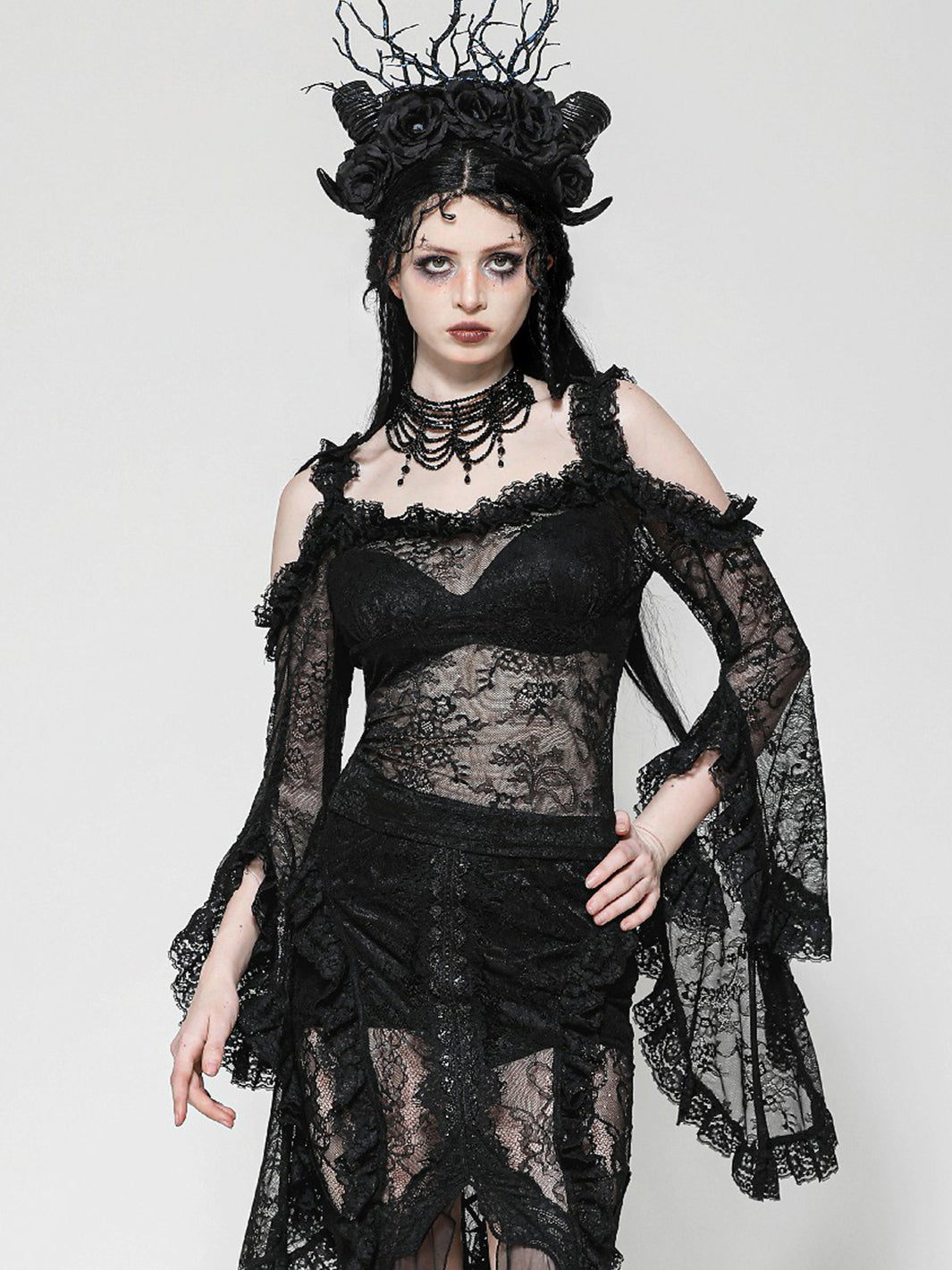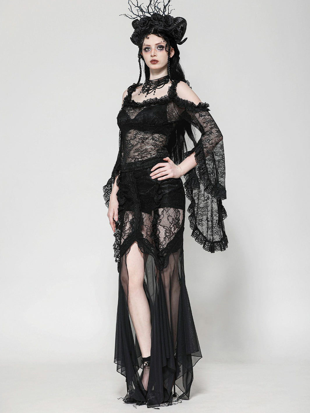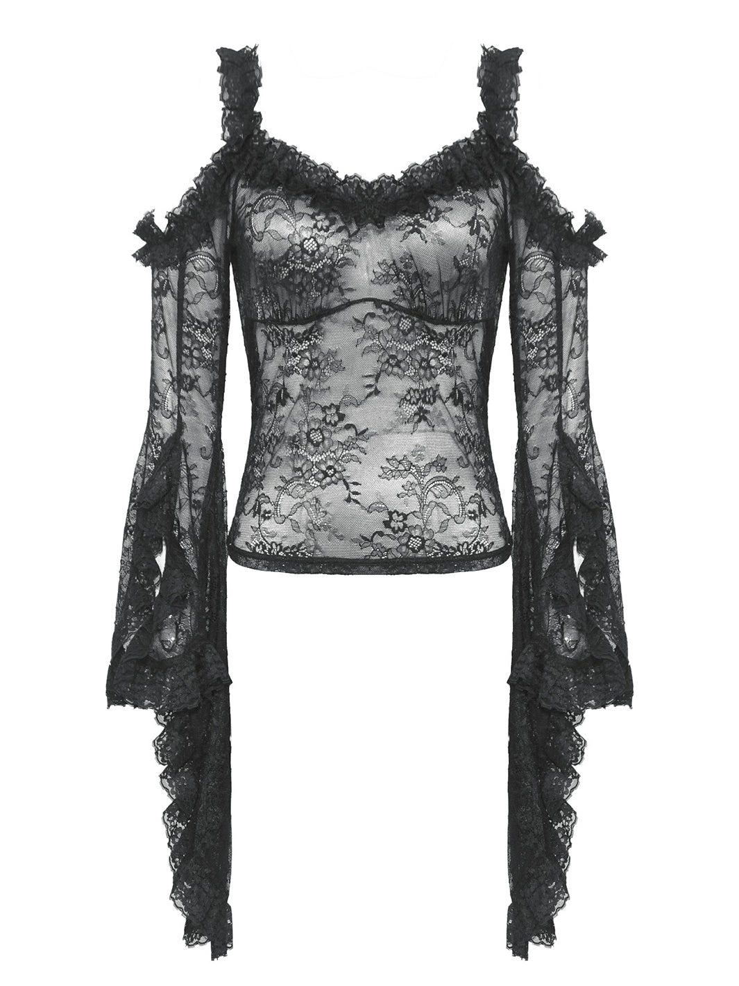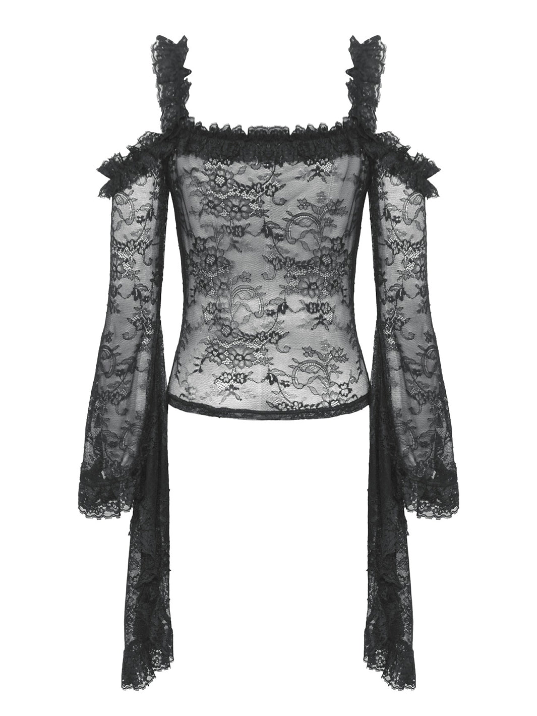 Give ‘em dark fairytale vibes in this sheer black lace top. Featuring off-shoulder ruffle details and ultra-dramatic flared sleeves, you'll be feeling your romantic fantasy.