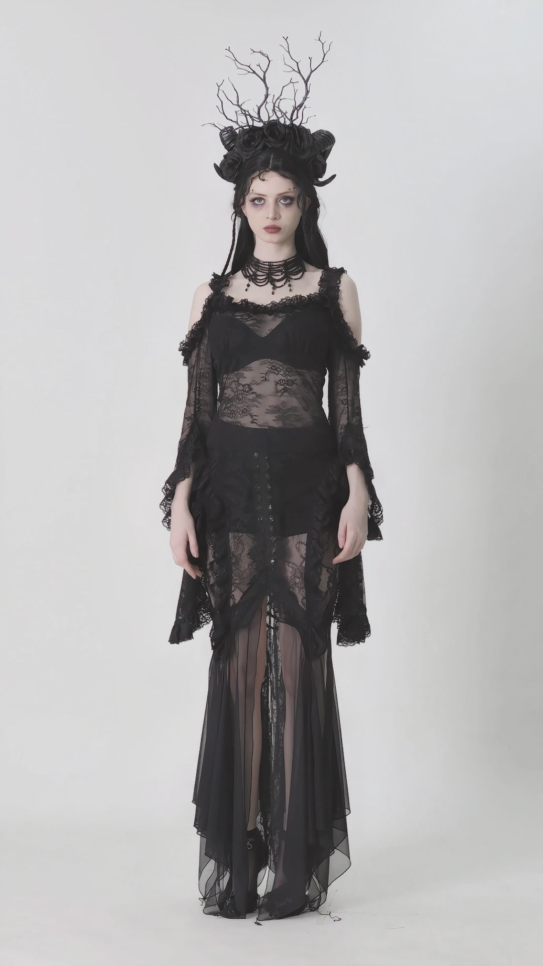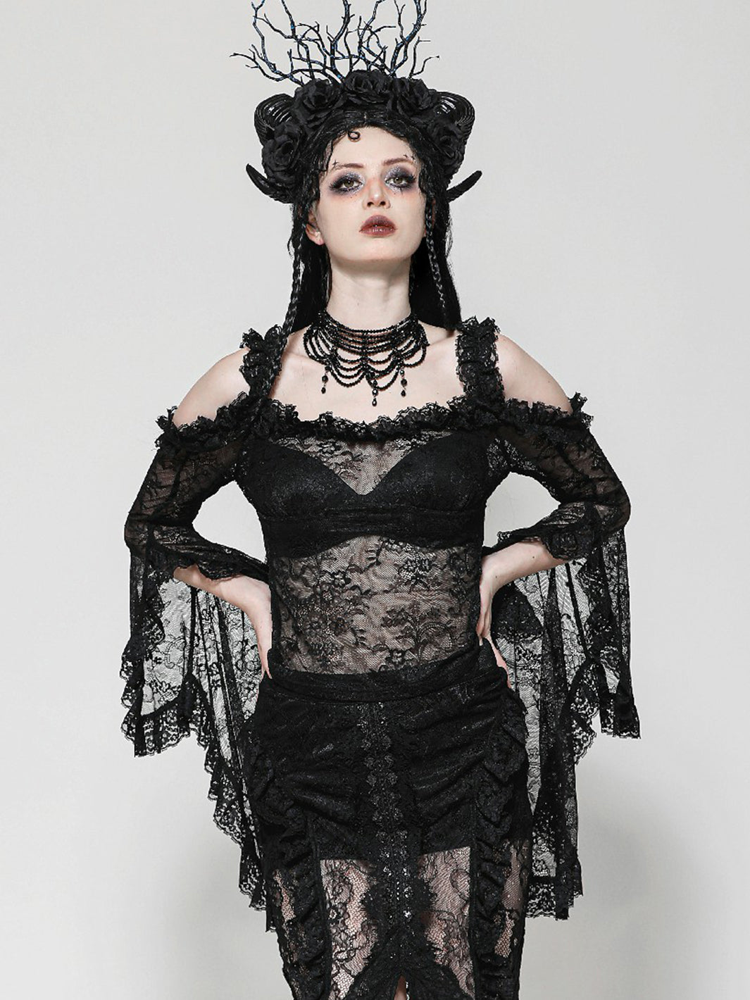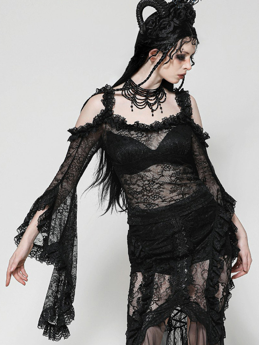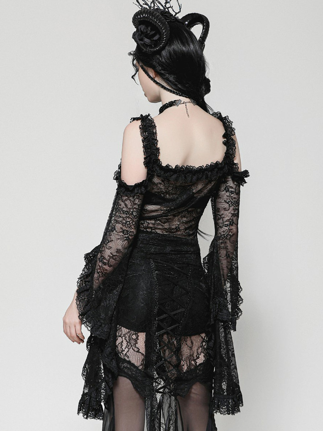 Give ‘em dark fairytale vibes in this sheer black lace top. Featuring off-shoulder ruffle details and ultra-dramatic flared sleeves, you'll be feeling your romantic fantasy.