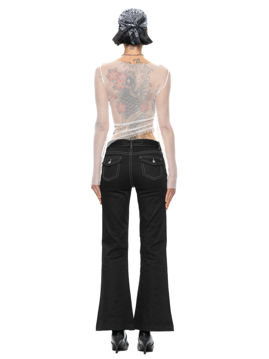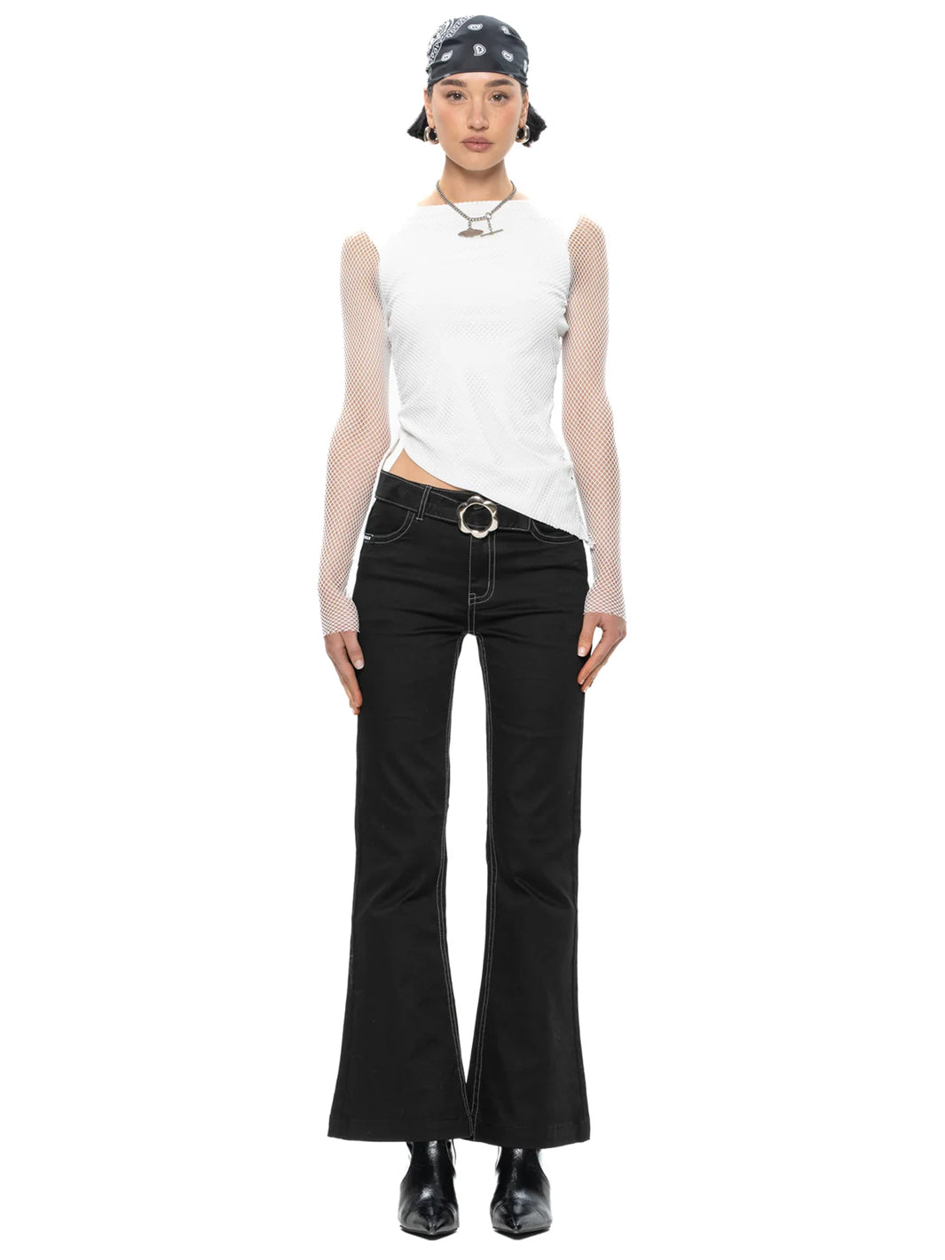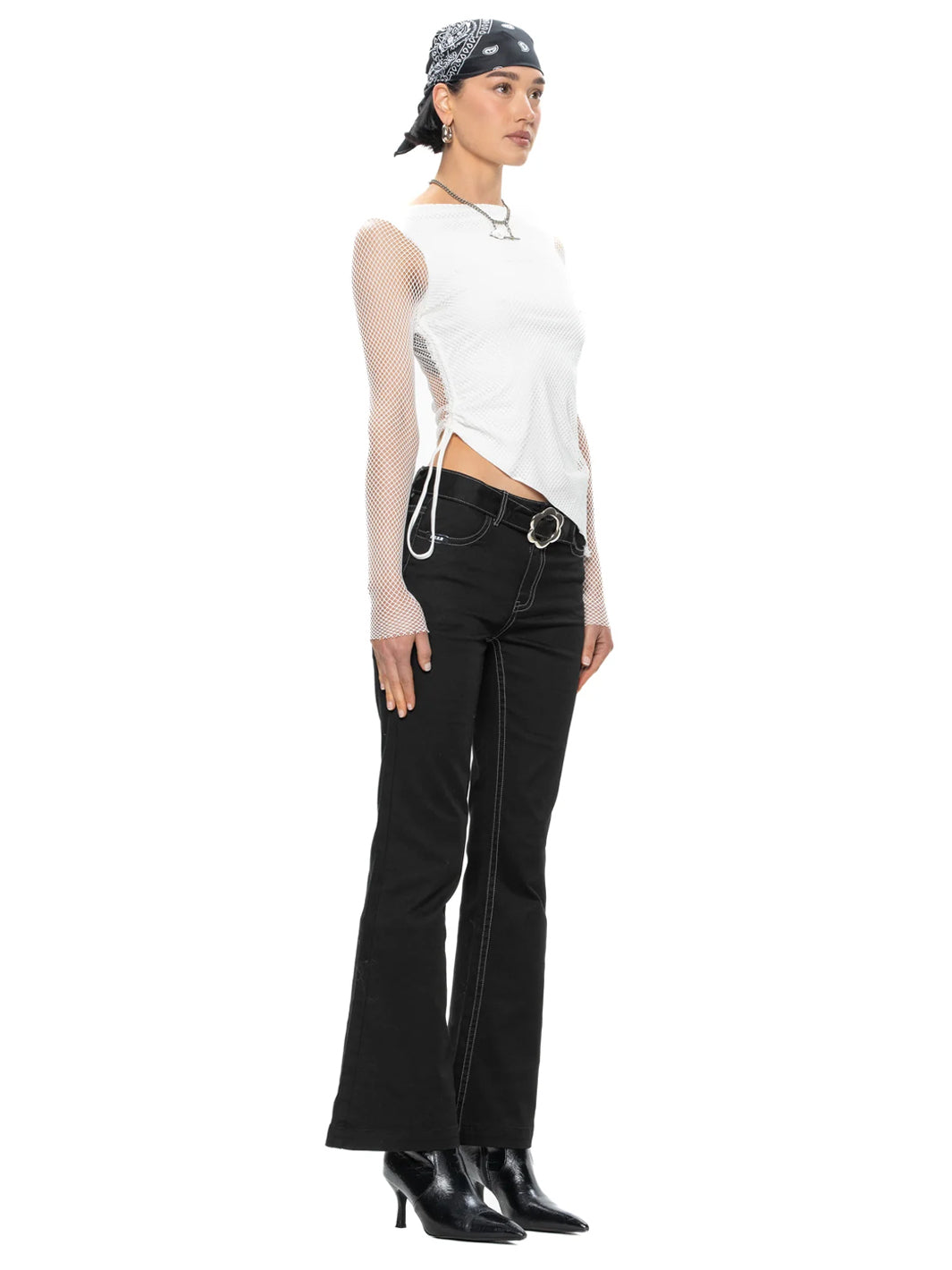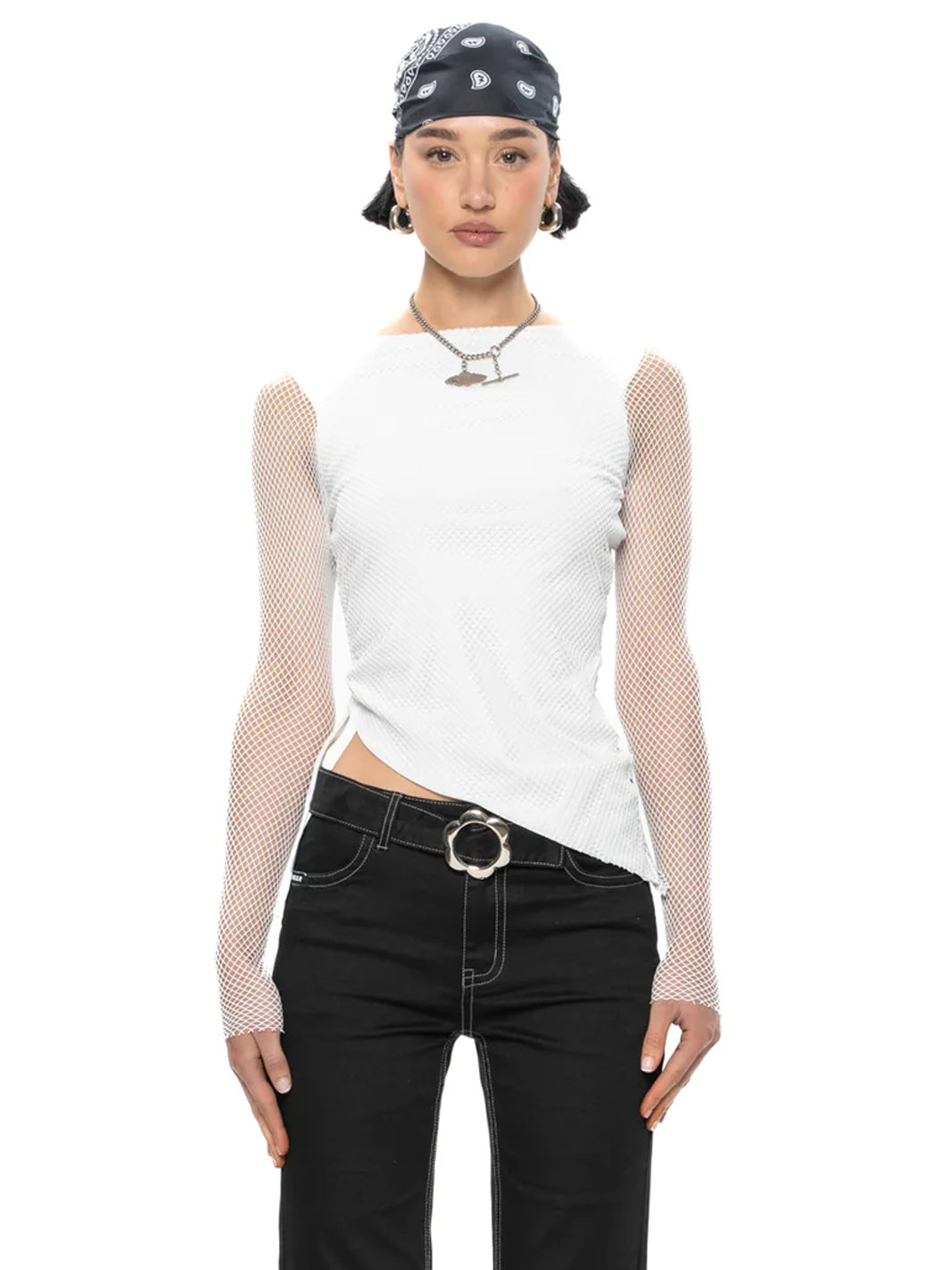 We are living for the Splice Top! With its white mesh long sleeves and adjustable side drawstring, this slay top has you covered in the front and open in the back - the perfect mix!
