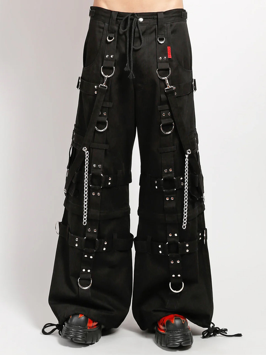 We can't get enough of Tripp NYC and now we are NOT taking these sick Harness Pants off - A clean black base layered with harness straps across the front and back, finished with removable chains and a zip off design that turns them into shorts. Heavy, detailed, and built to stand out.