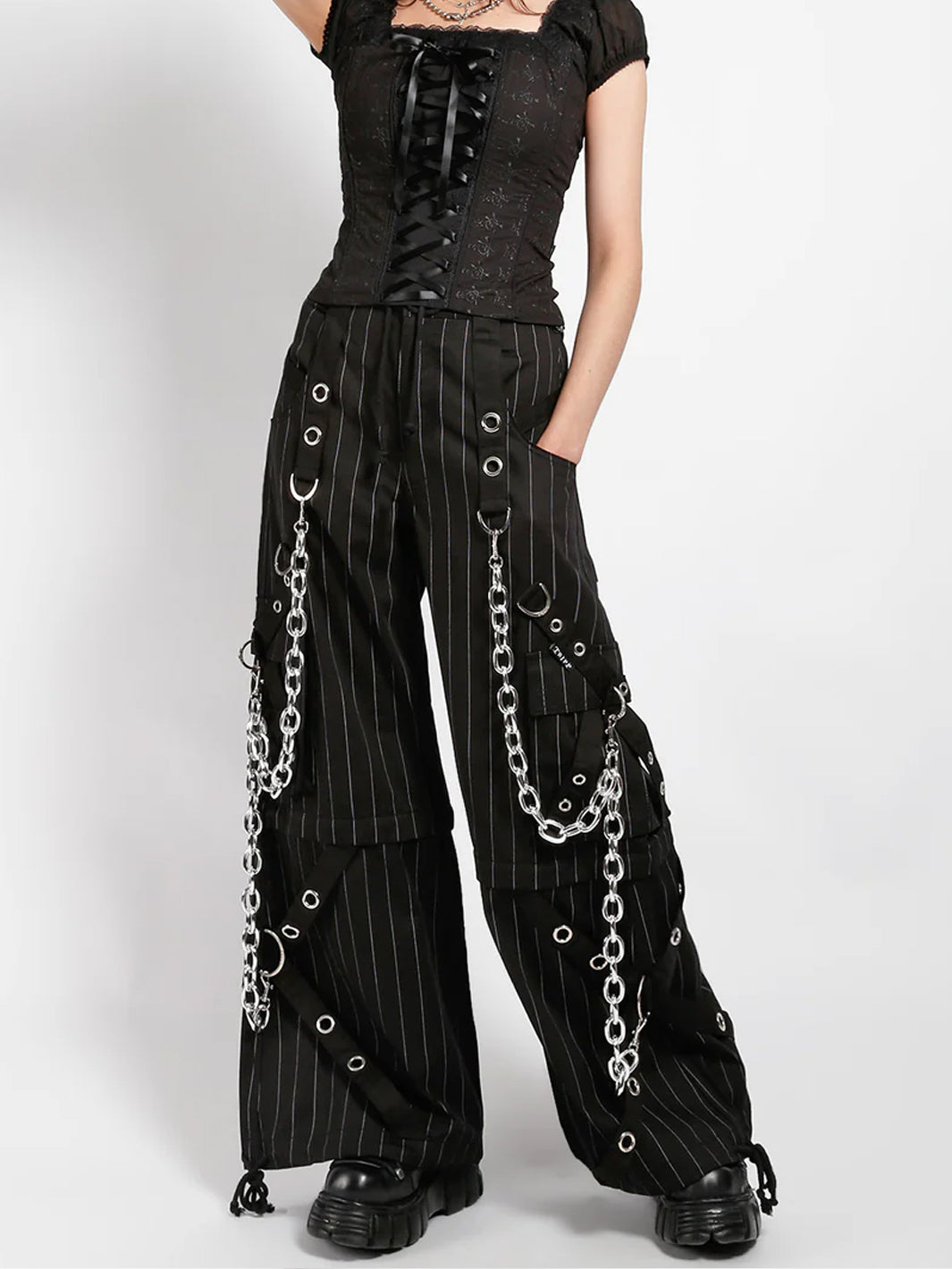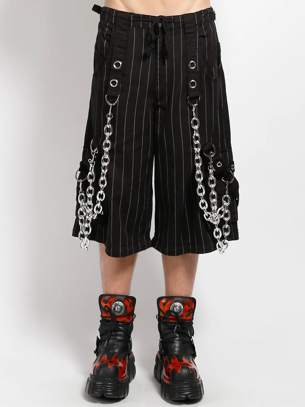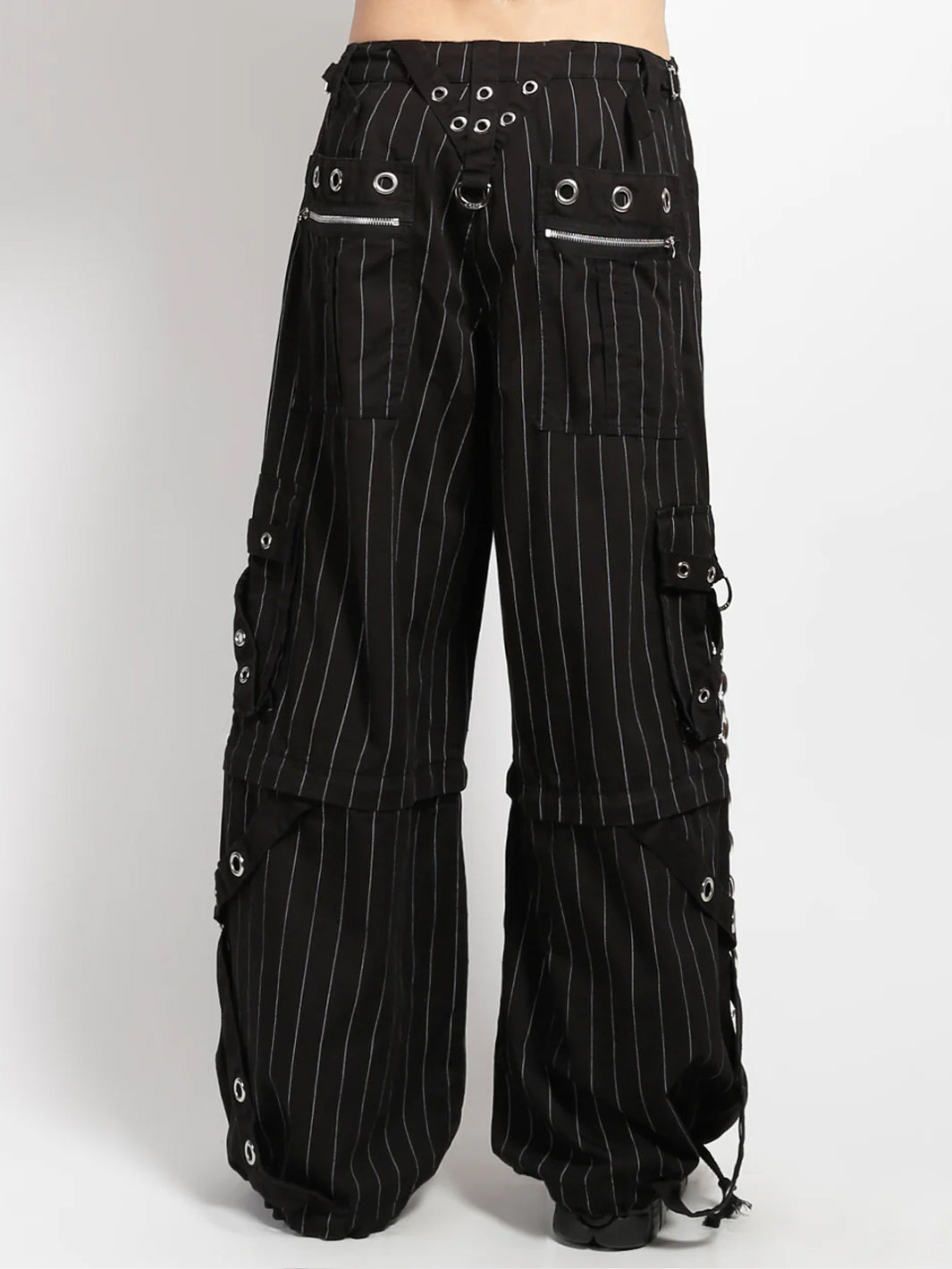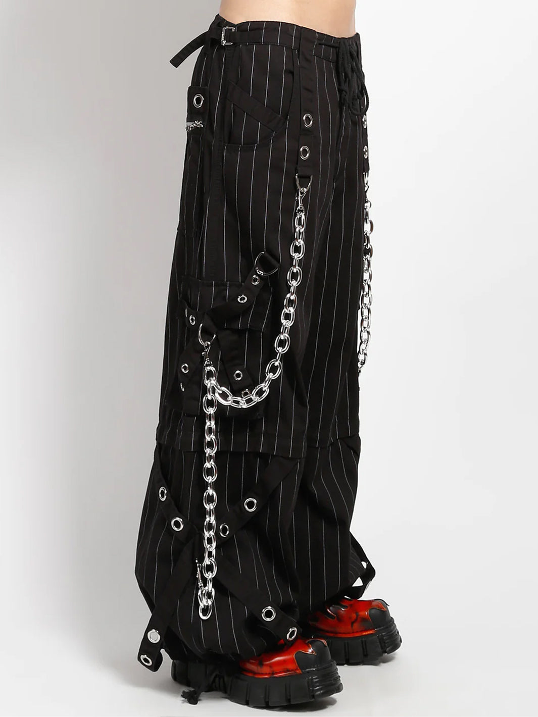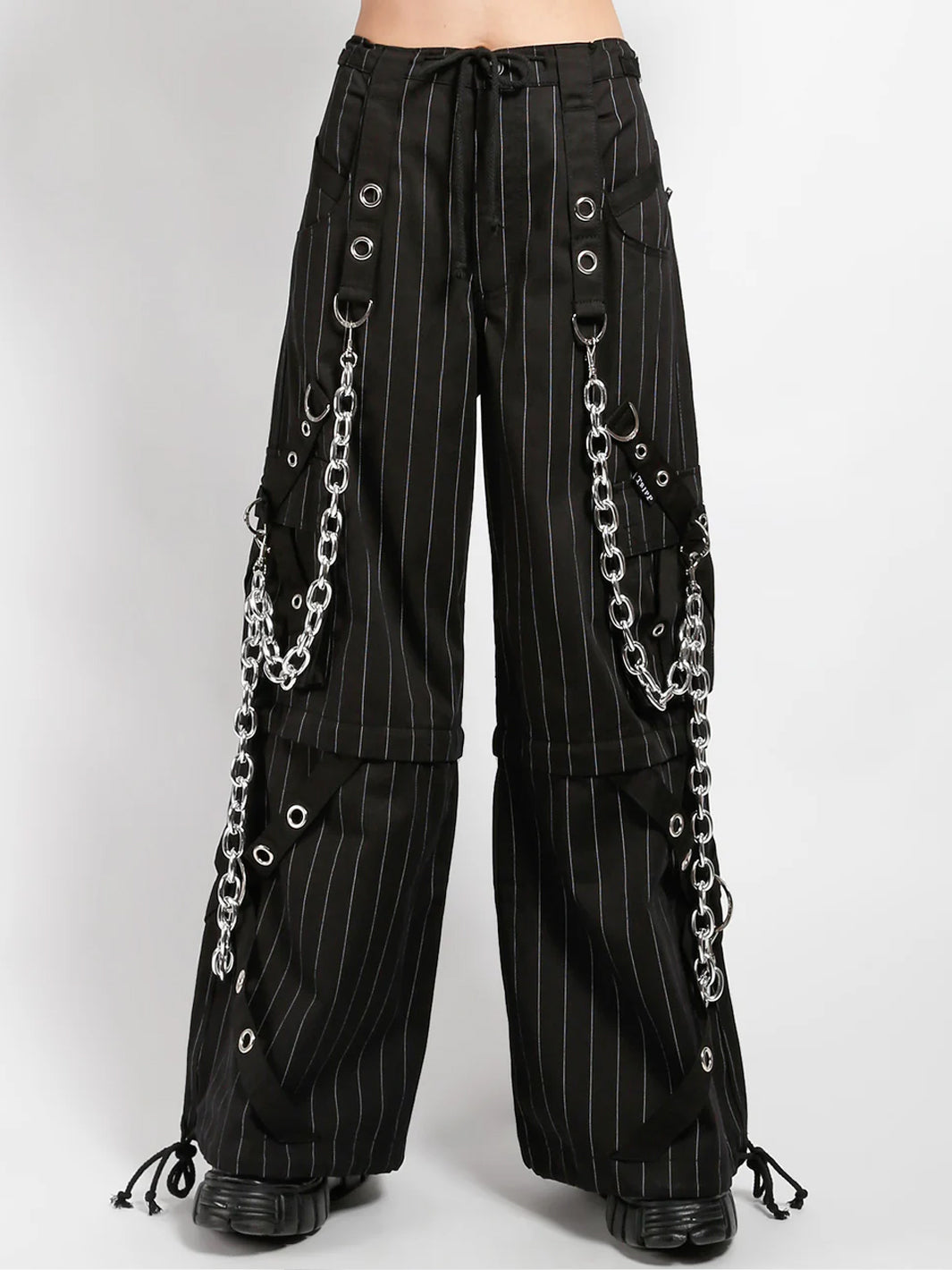 These huge chain thin white stripe pants zip off into shorts and feature removable chains, adjustable ankles, D-rings, and pockets.