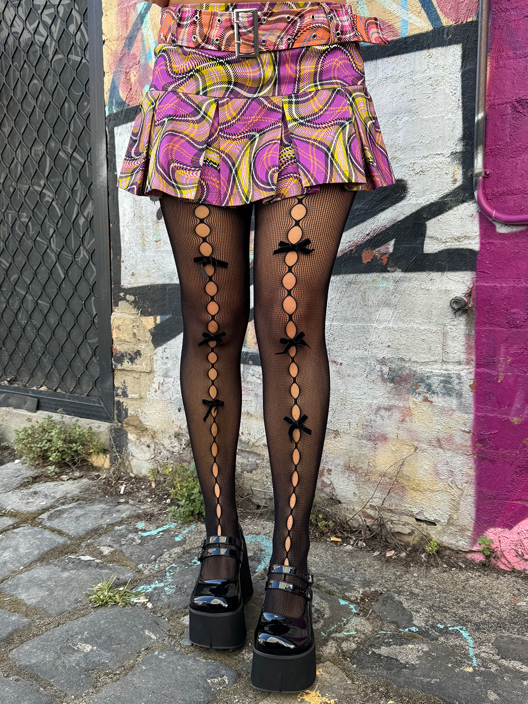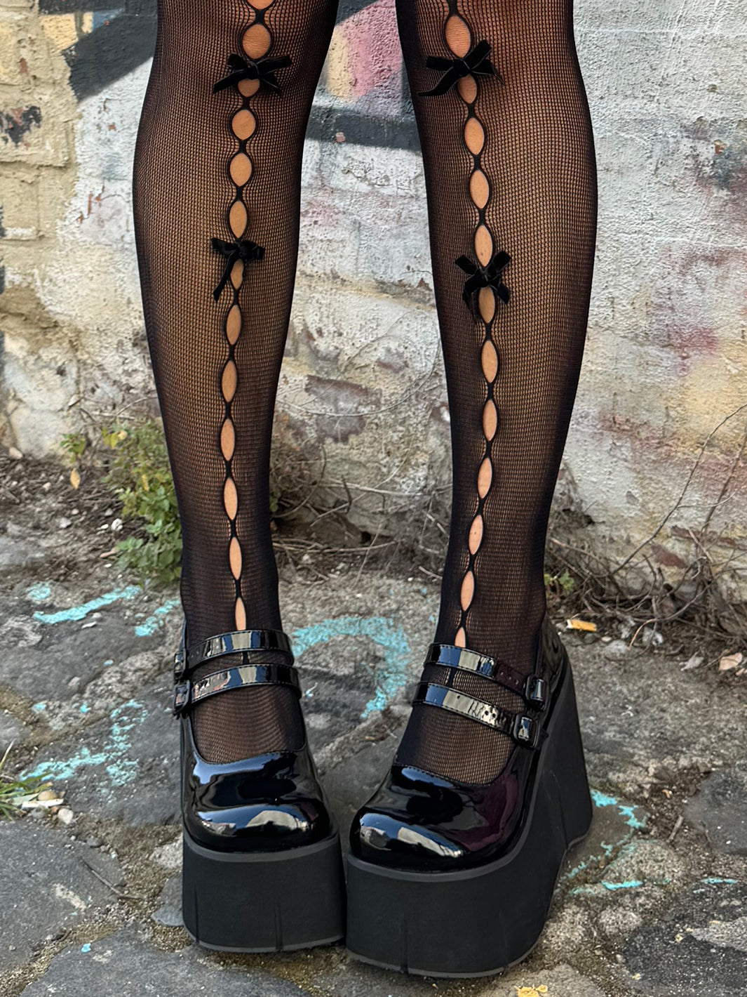 The sweetest lil bow covered tights, in a stretchy black colourway with black ribbons running up the front.