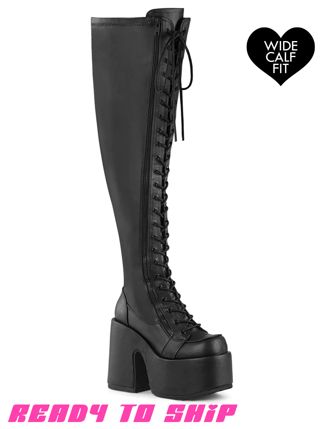 DEMONIA CAMEL 300 WIDE CALF PLATFORM BOOTS - BLACK VEGAN LEATHER