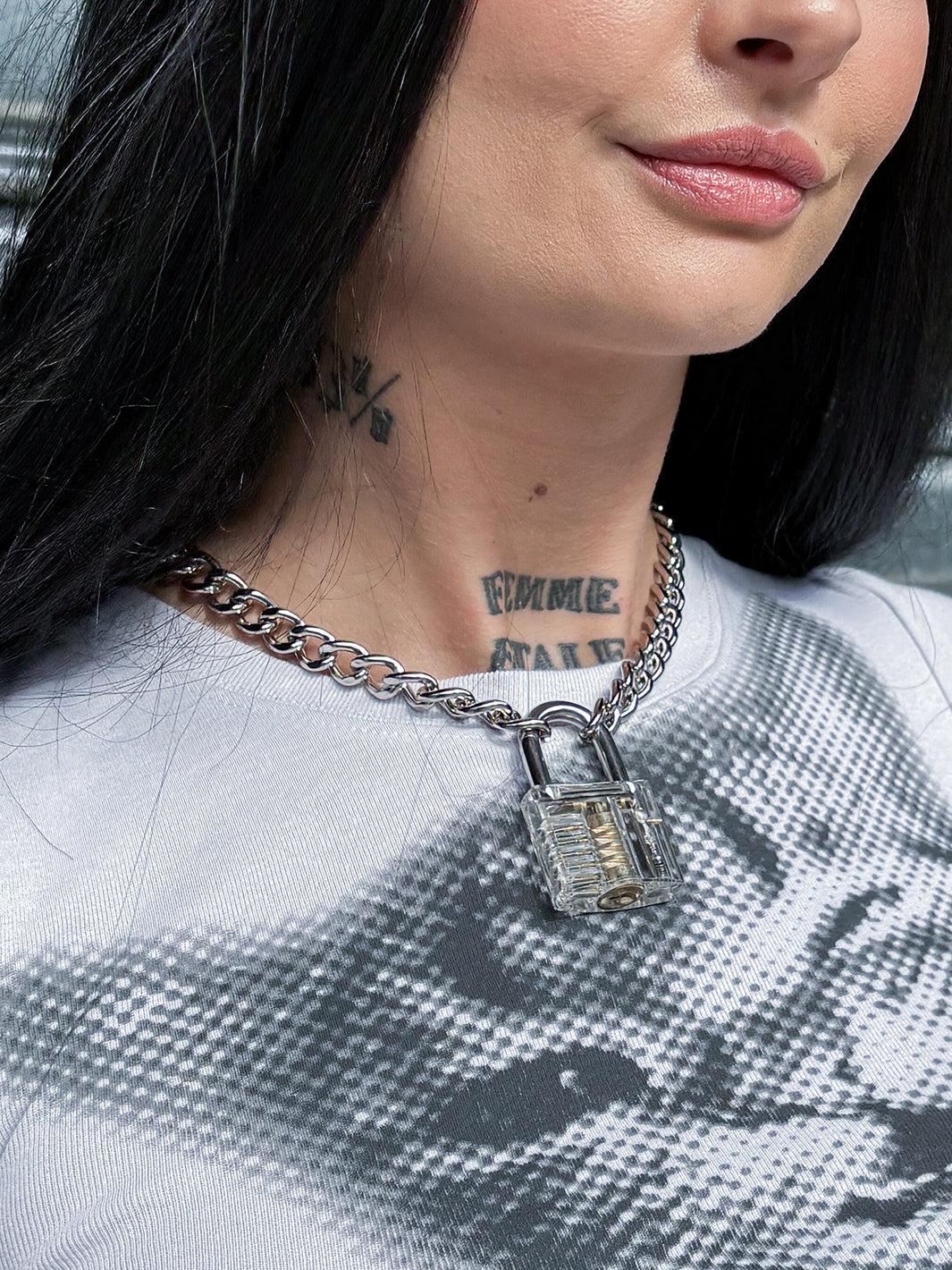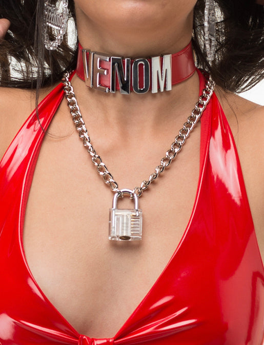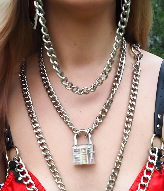 • Clear padlock front on thick silver chain