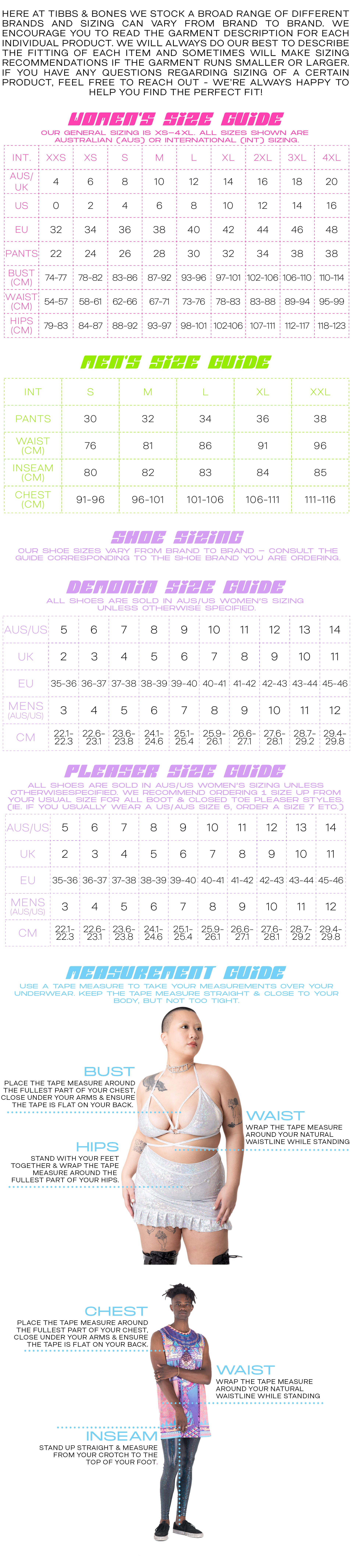 Please be sure to read item descriptions thoroughly before purchasing. If you require further information on an item or sizing, please be sure to contact us at help@tibbsandbones.com or +61413737796. Keep in mind that colours of items may vary slightly on different computer/phone screen displays.