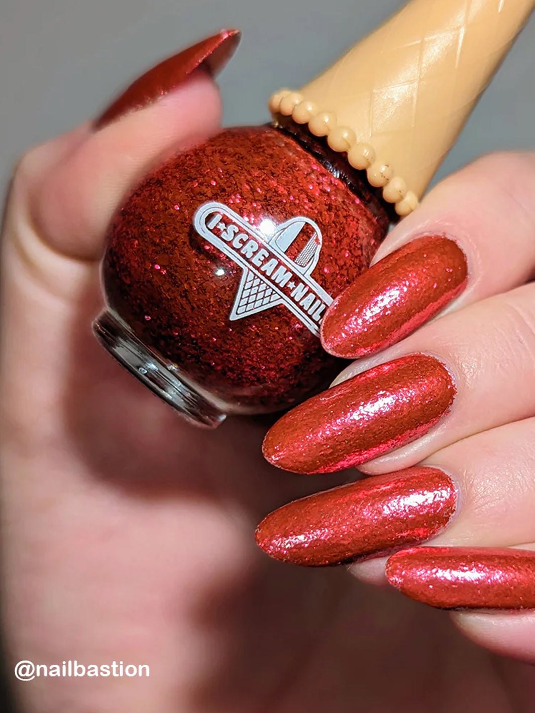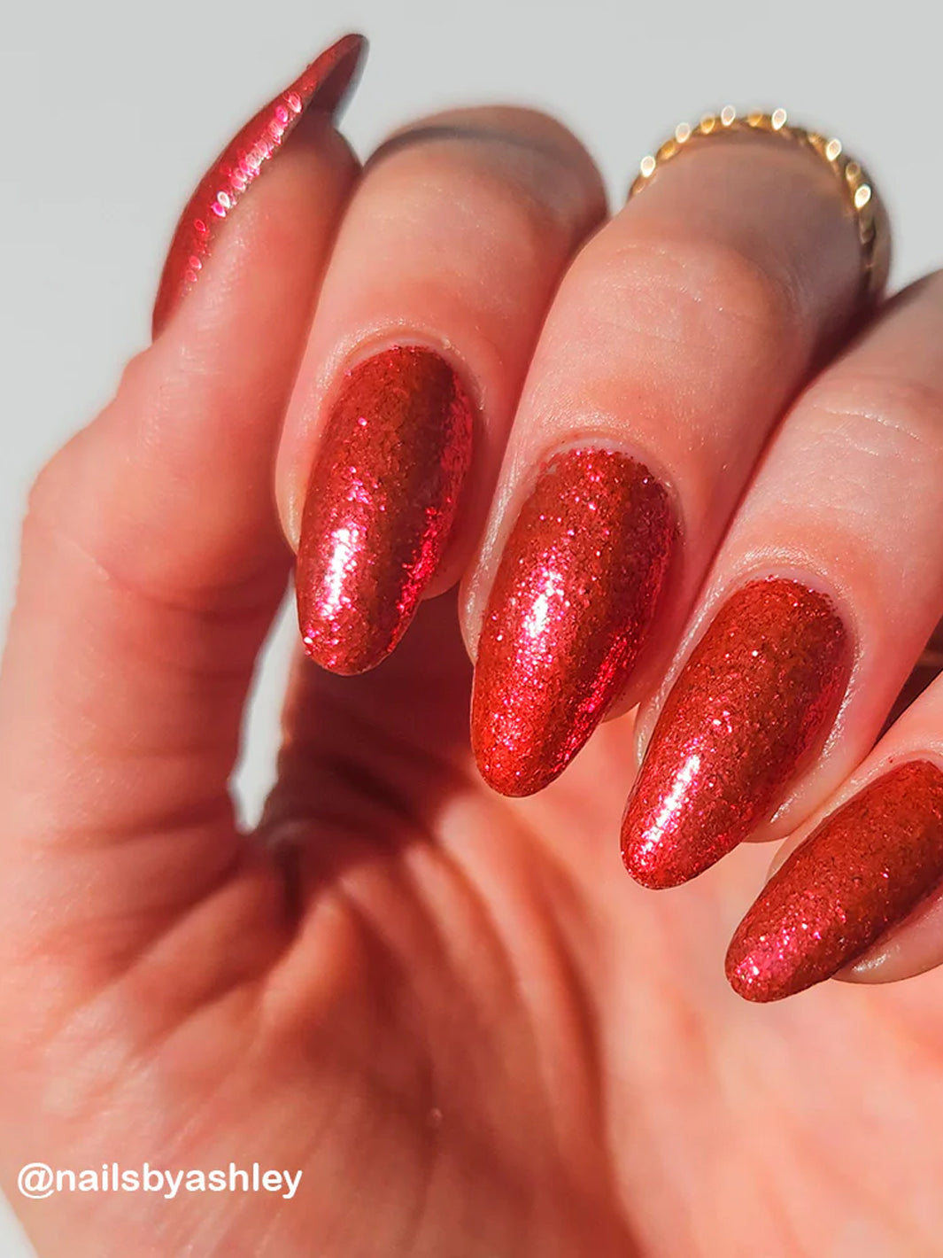 With an explosion of metallic glitter flakes this ruby red nail shade will give your nails an ultra shiny luxurious finish. For full opacity, it is advised to do 3 coats with max drying time between each coat.