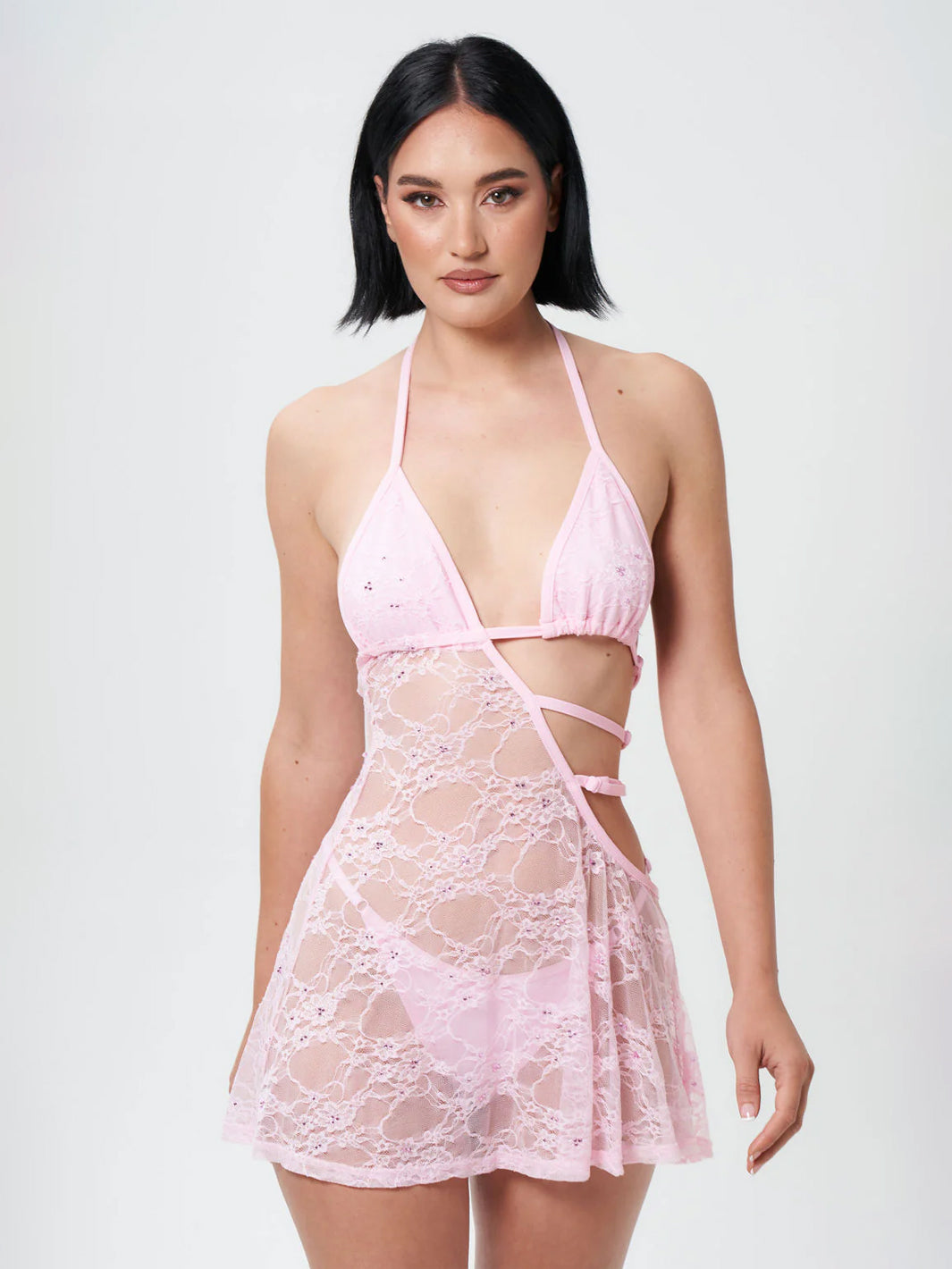 Taking barely there dress to the next level! Feel empowered in this buttery soft lace dress featuring cut outs and bikini style top. The Dreamstate Dress comes with a matching g-string and is designed to be paired with the Lust & Lace Scarf or Mindwave Hood.