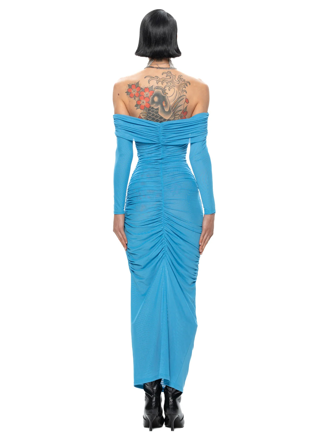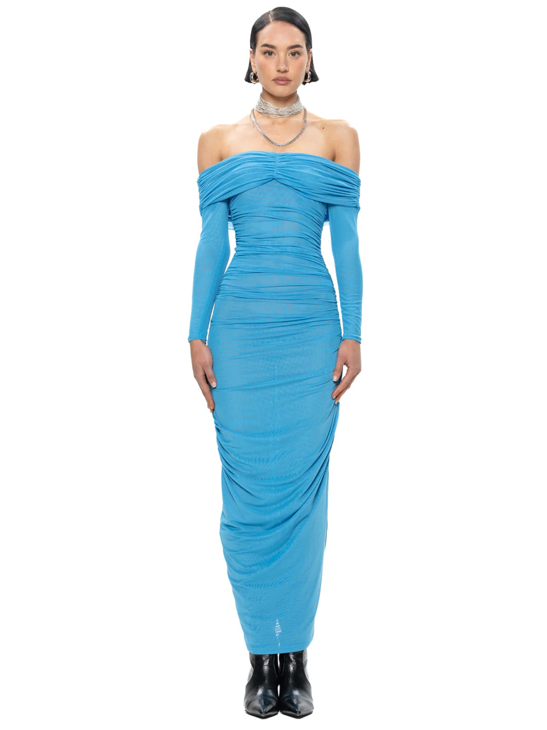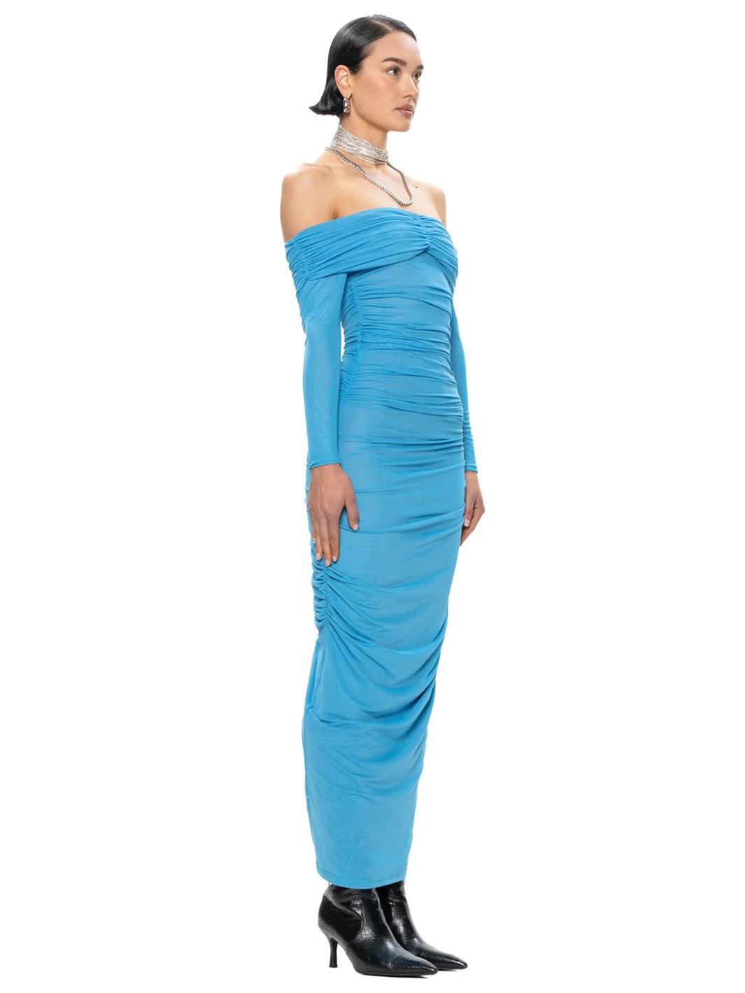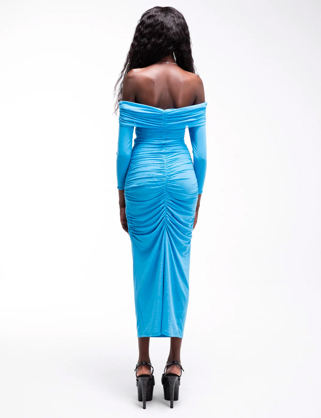 The stunning Emily Dress is a midi length, off the shoulder Dress. The dress outer layer is mesh and it is fully lined with mesh. The dress has ruching down the side seams and the centre back to give your bum a nice peachy look with curves in all the right places!