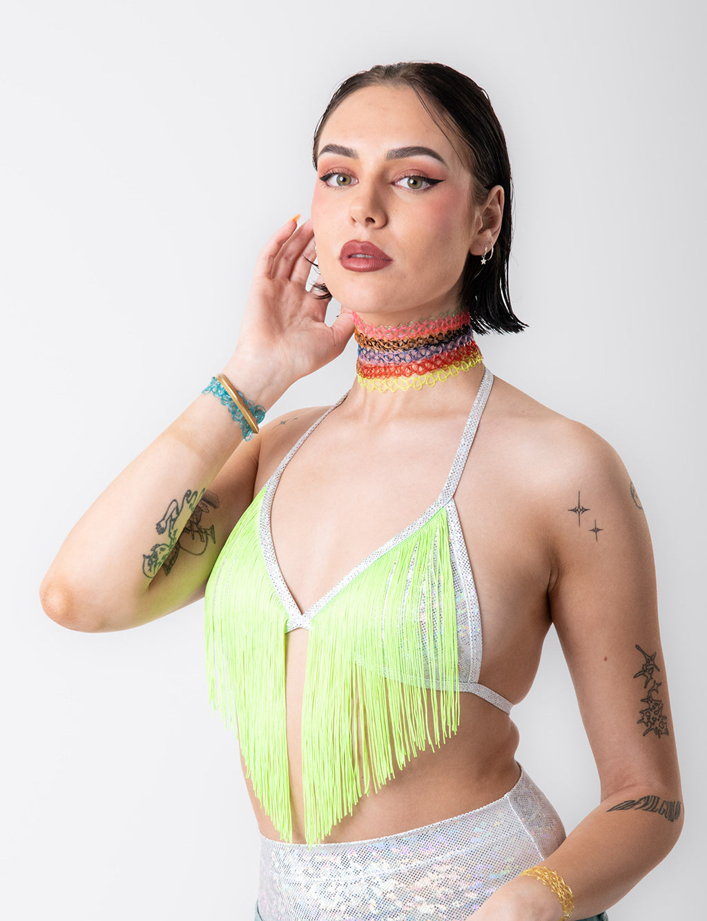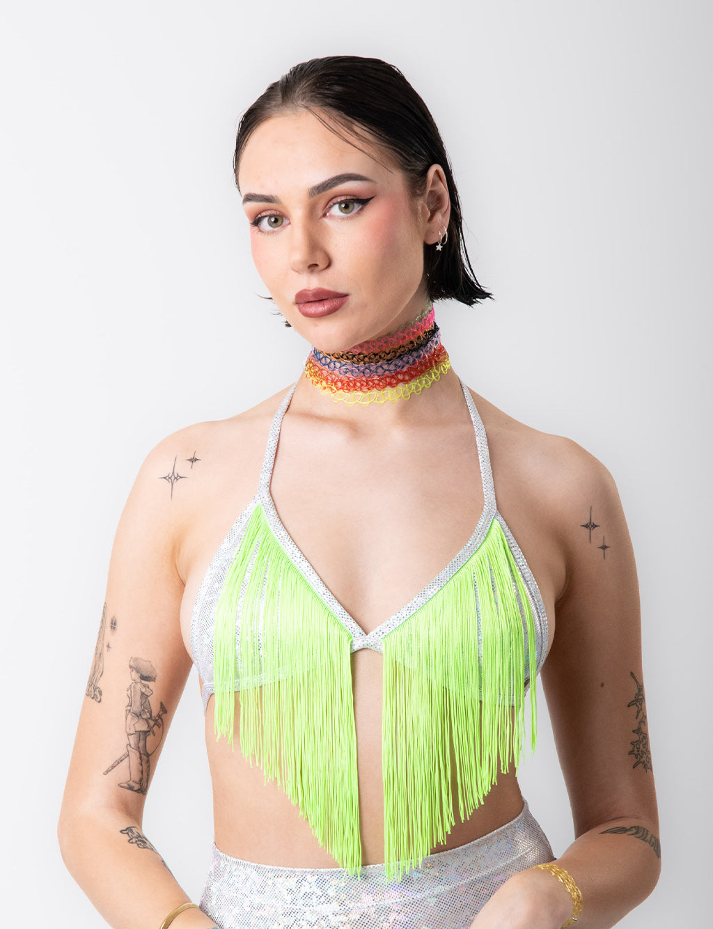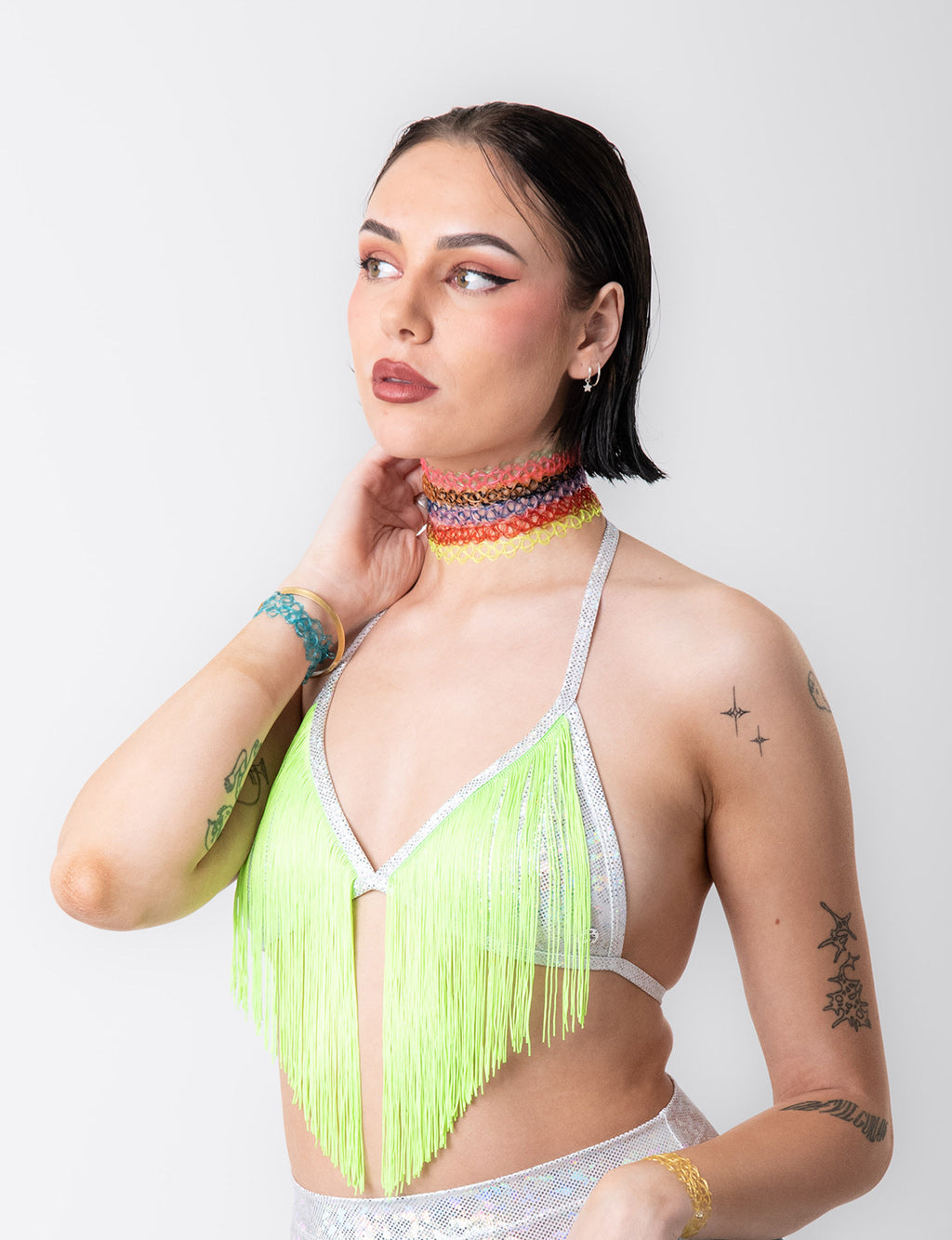 Such a fun top - in shimmering hologram white, this fringe trimmed crop is the cutest! Match it with the Hot Shorts for a v cute iridescent fit - or take it one step further with the fringe trimmed chaps - LOVE!