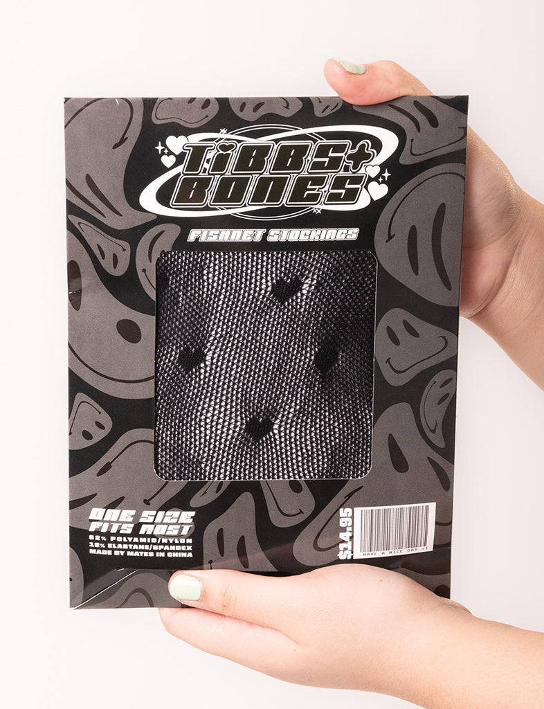 High waisted and covered in little hearts, these small mesh fishnets are perfect to slip on with your fit.