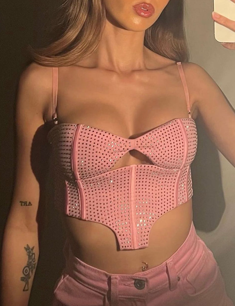 Y2K called and she said wear me!!! Glam, pink and jewelled, this cut out corset accentuates all the right places. The front hem detailing elongates the torso and cinches the waist in a custom rhinestone fabric. In a delicious balance of both structure and femininity this corset will allow you to be the moment.