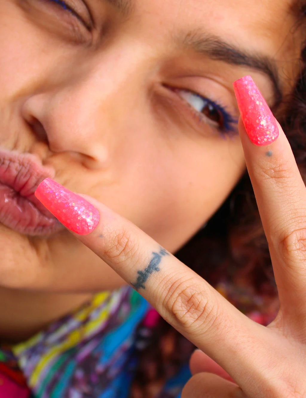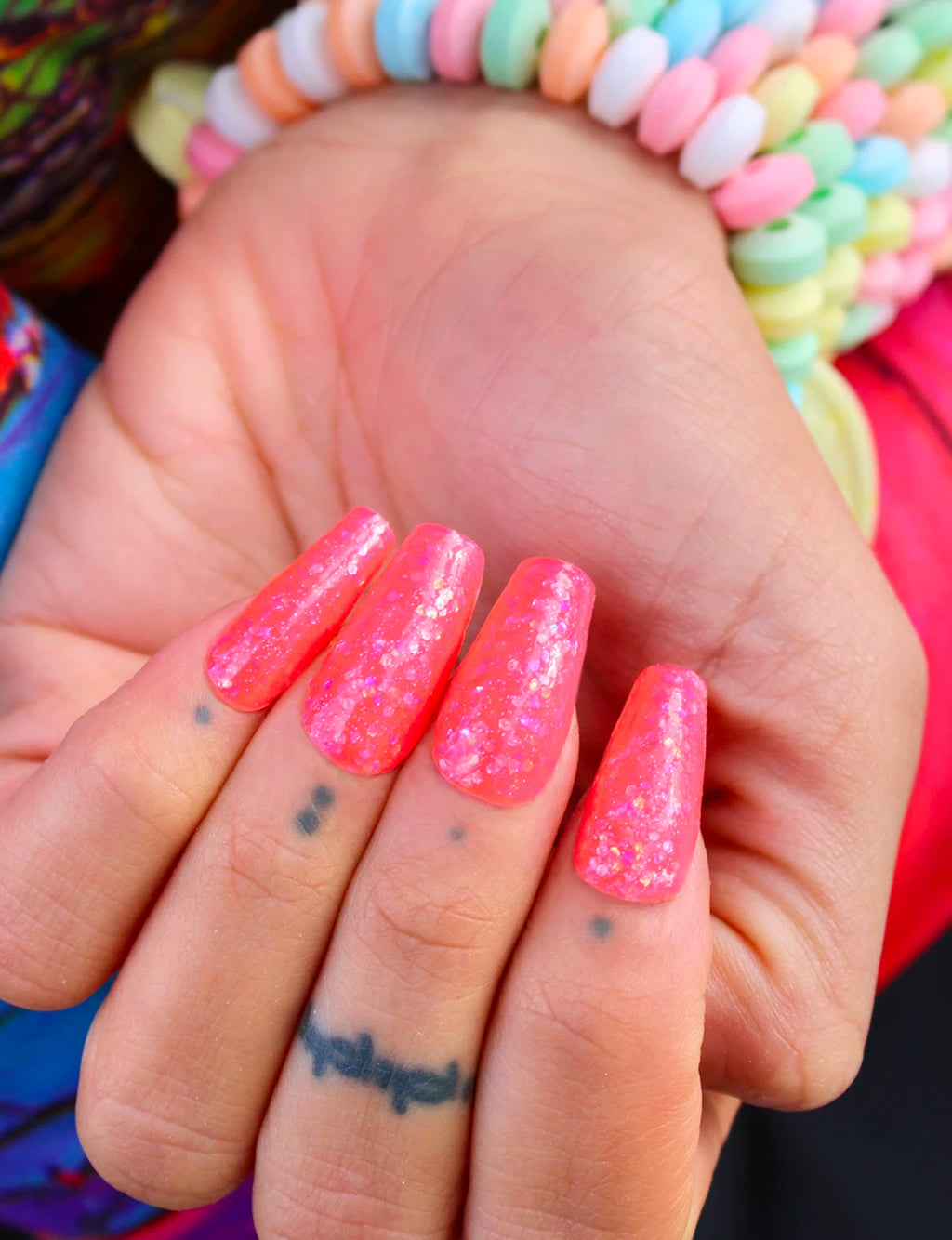 HAWWT HONEY! This cute coral shade comes with holographic & iridescent glitter flakes