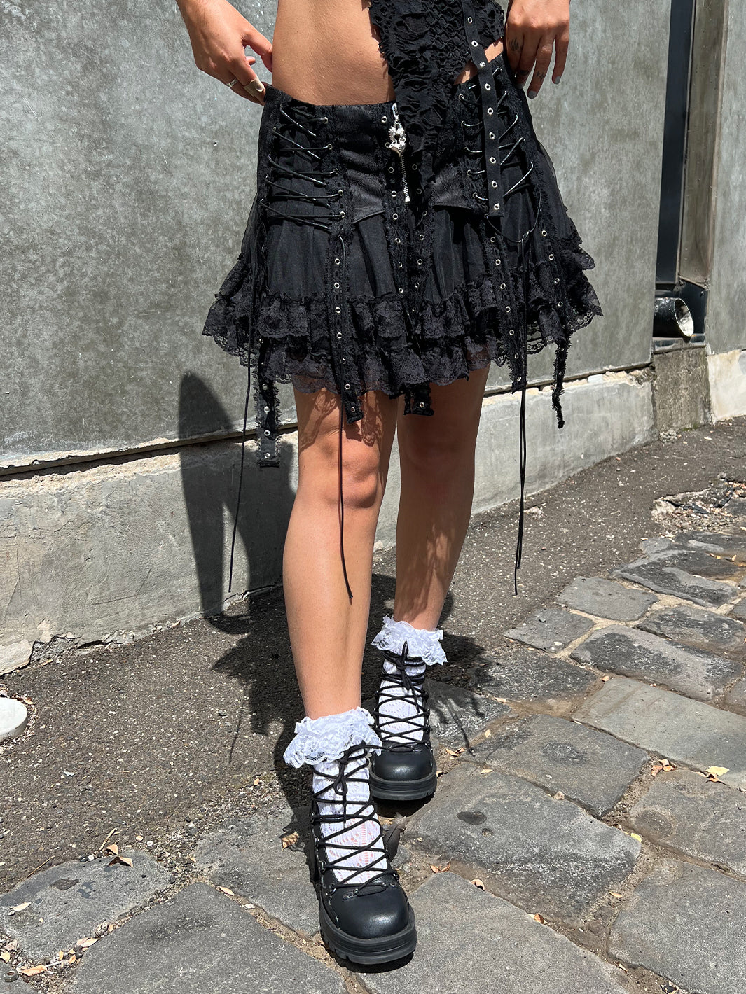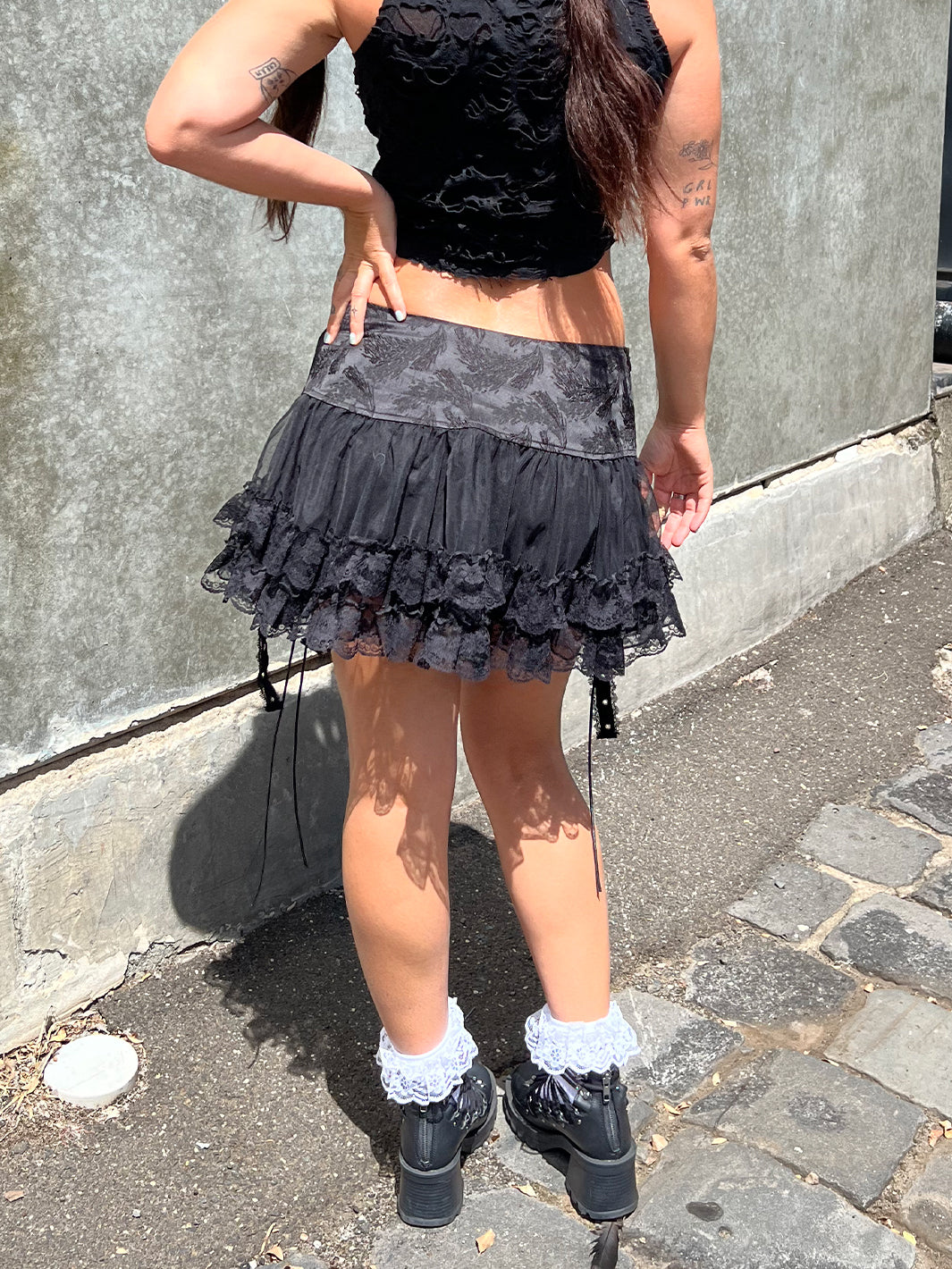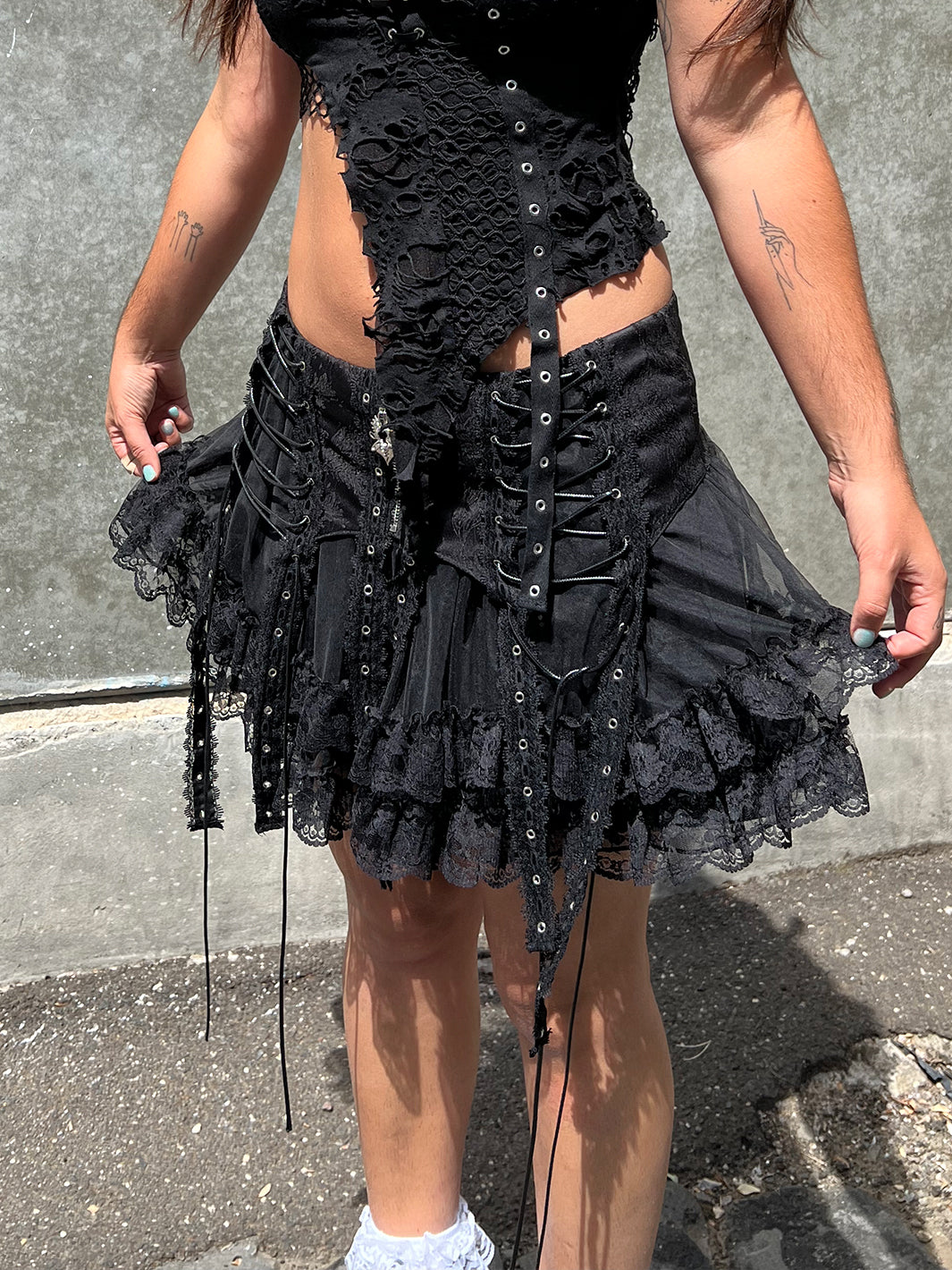 Indulge your dark side with the Helena Tulle Mini Skirt. This goth & gorg piece features a unique hanky hemline and a layered mix of fabrics, making it the perfect choice for alt fashion lovers. The mini pixie cut and tulle fabric add the perfect edge to any fit.