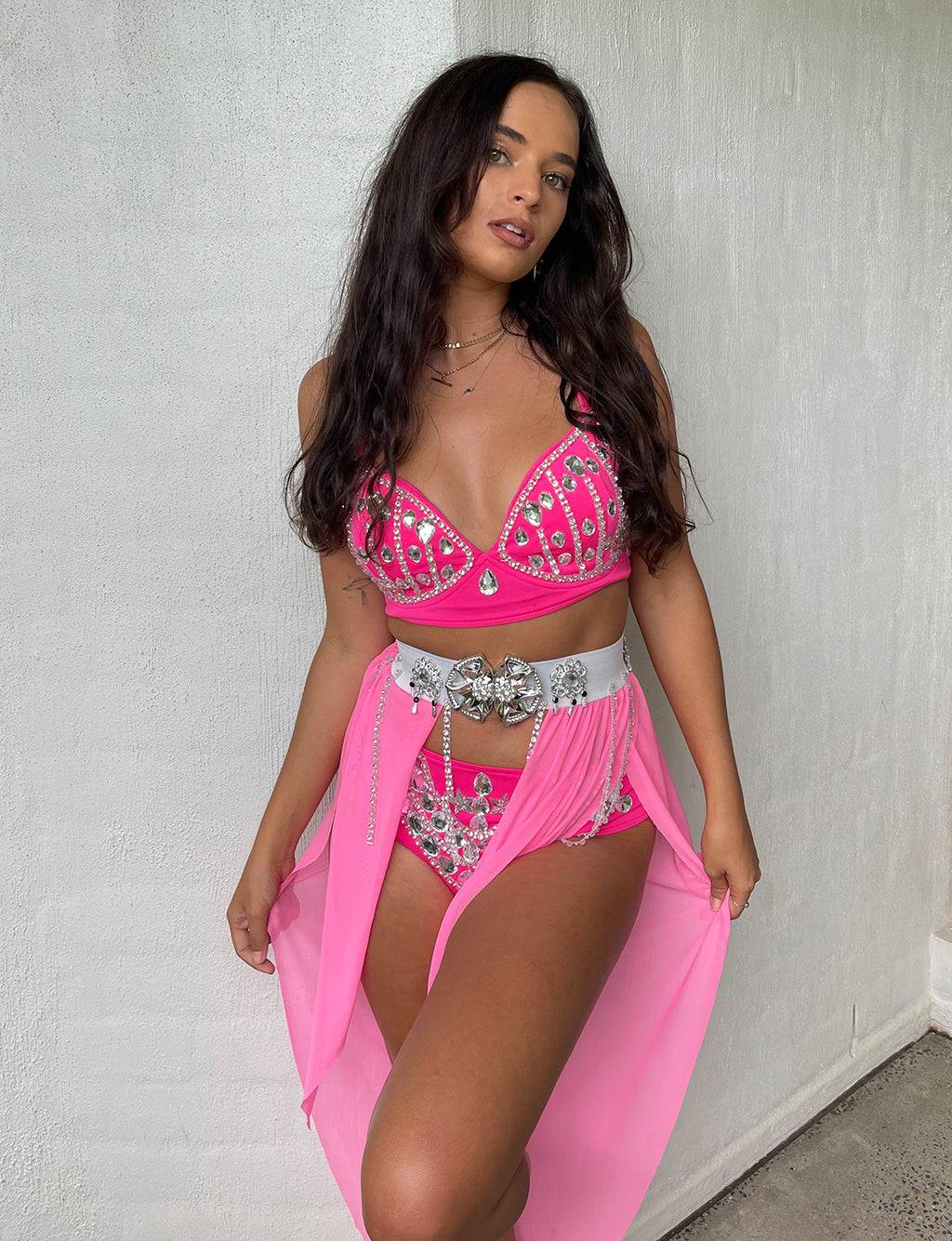 OUTFIT SORTED. The magical "Queen Of Splendour" Set - the hardest time you will have is trying to decide what colour you want to rep! Available in over 9 colours with a beautiful, bedazzled bra, matching panties & skirt overlay, all you have to worry about is your glitter!
