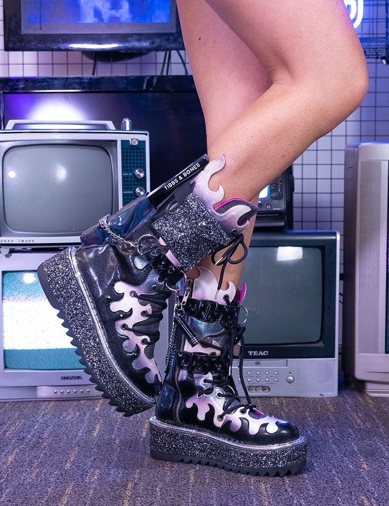 These boots are made for stomping! Welcome the 'Super Hot' combat boots from our EXCLUSIVE collab with Melbourne Shoe Visionaries Irregular Choice. These combat boots have it all glitter, flames and a super comfy platform - perfect for stoping around your fave festival and they extra additions added to these boots will blow your mind, not only can they light up, theres a whistle, torch, fan and zip pouch included.