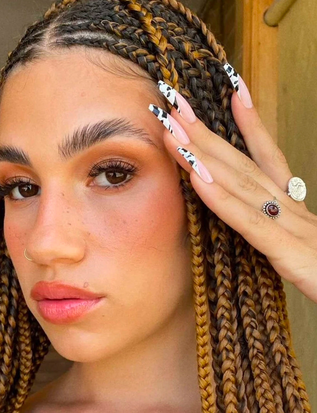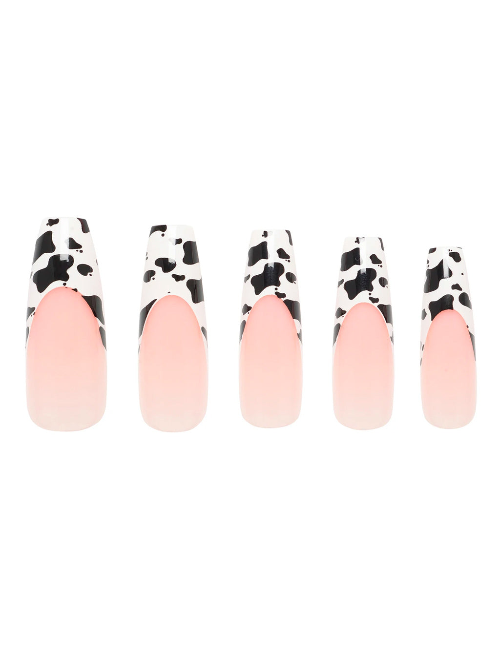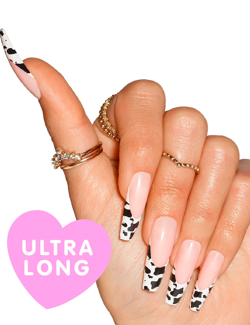Unleash your inner cowgirl in our classic French mani with a graphic, black and white, cow printed tip.