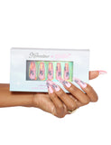 - Comes in a reusable box with a buffer, nail glue, cleansing pad, orange stick & 24 nails of different sizes.