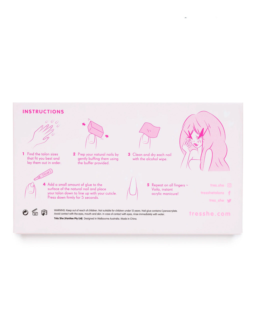Instant manicure?! Say less, Tres She (pronounced trashy) Instant Acrylic’s bring the salon home with a range of press on nail designs decked out in gem embellishments, cow print, flame print, milky nails and much more!