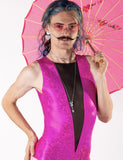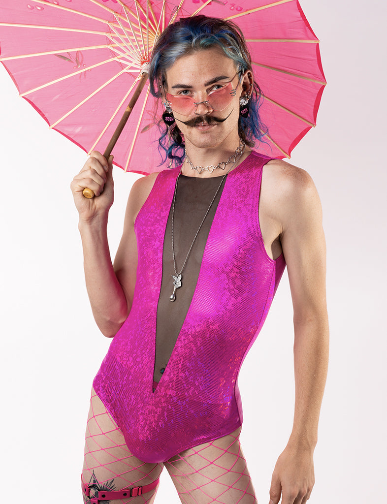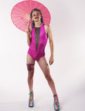 In popping-hologram pink, this bodysuit is a must have! It features a deep-v back with contrasting black mesh. We love it!