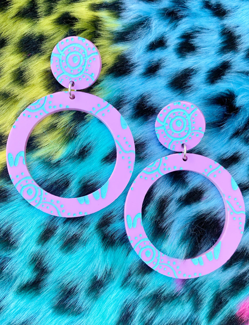 These hand painted small hoop earrings will be your new faves. Covered in indigenous art and in the most stunning pastel colours. Slip these in ya ears and make the most beautiful statement.